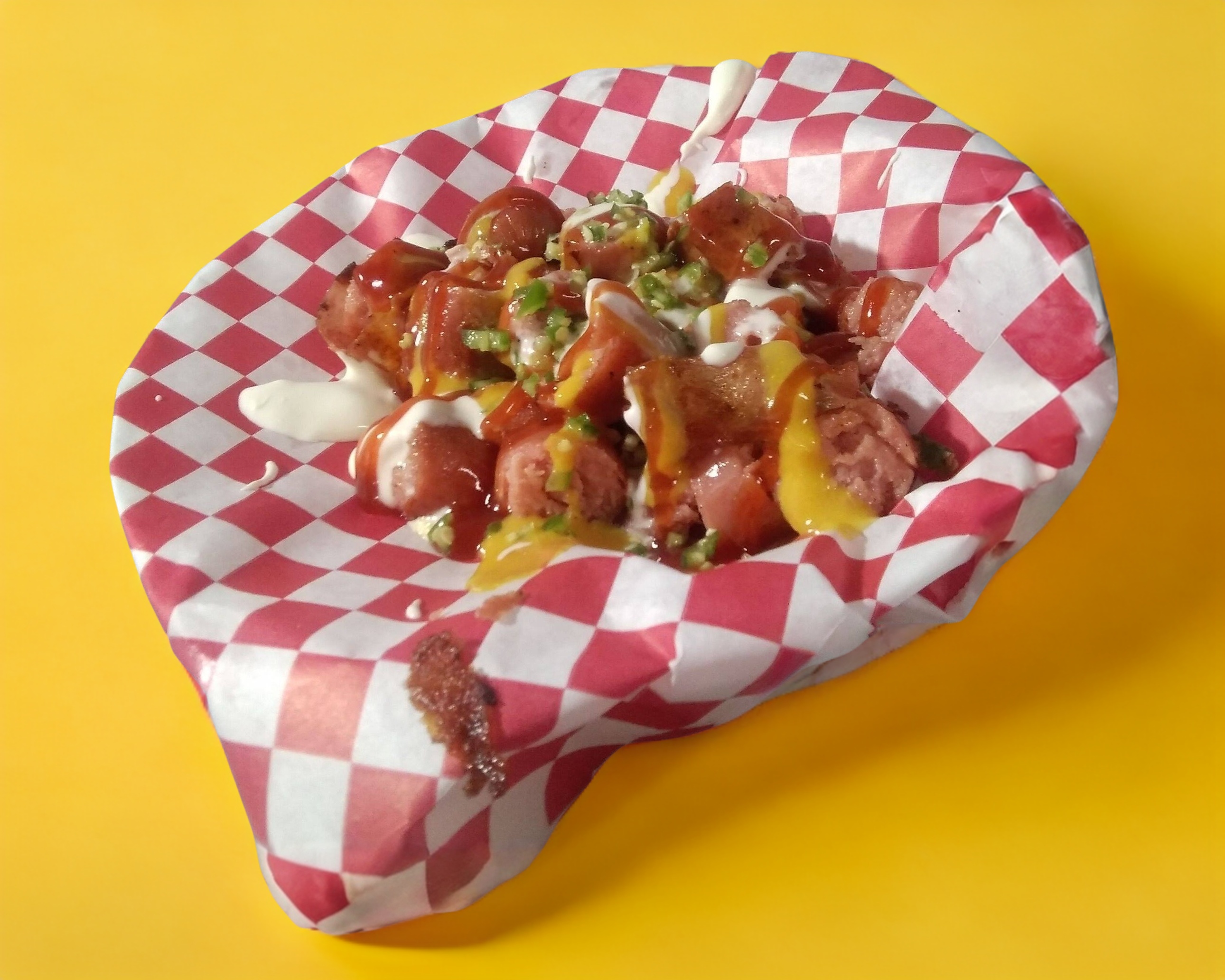 Salchicha de pavo con tocino en pan artesanal, seleccion los ingredientes a tu gusto.