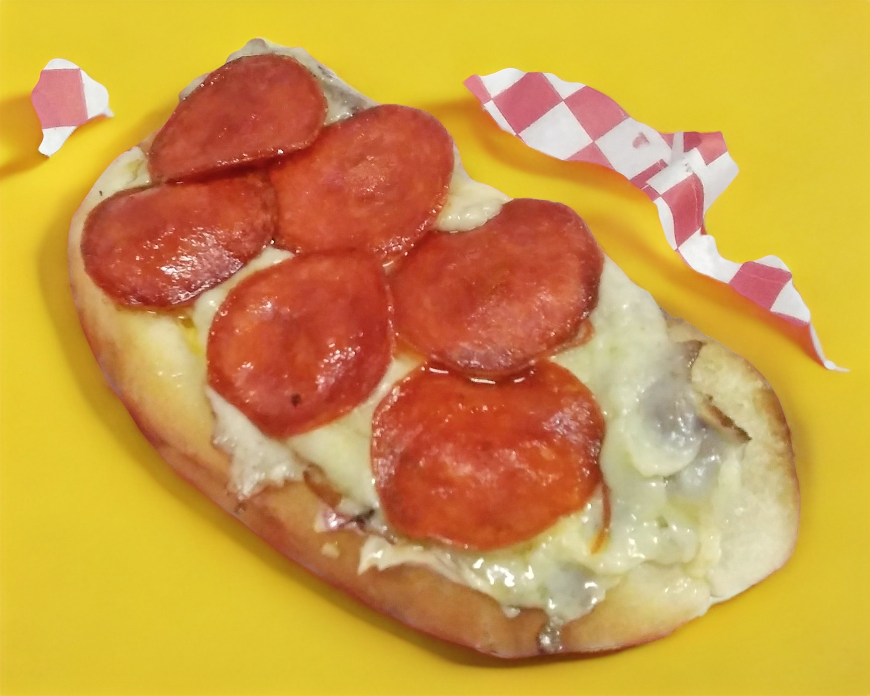 Hot dog de queso fundido acompañado de peperoni a la plancha