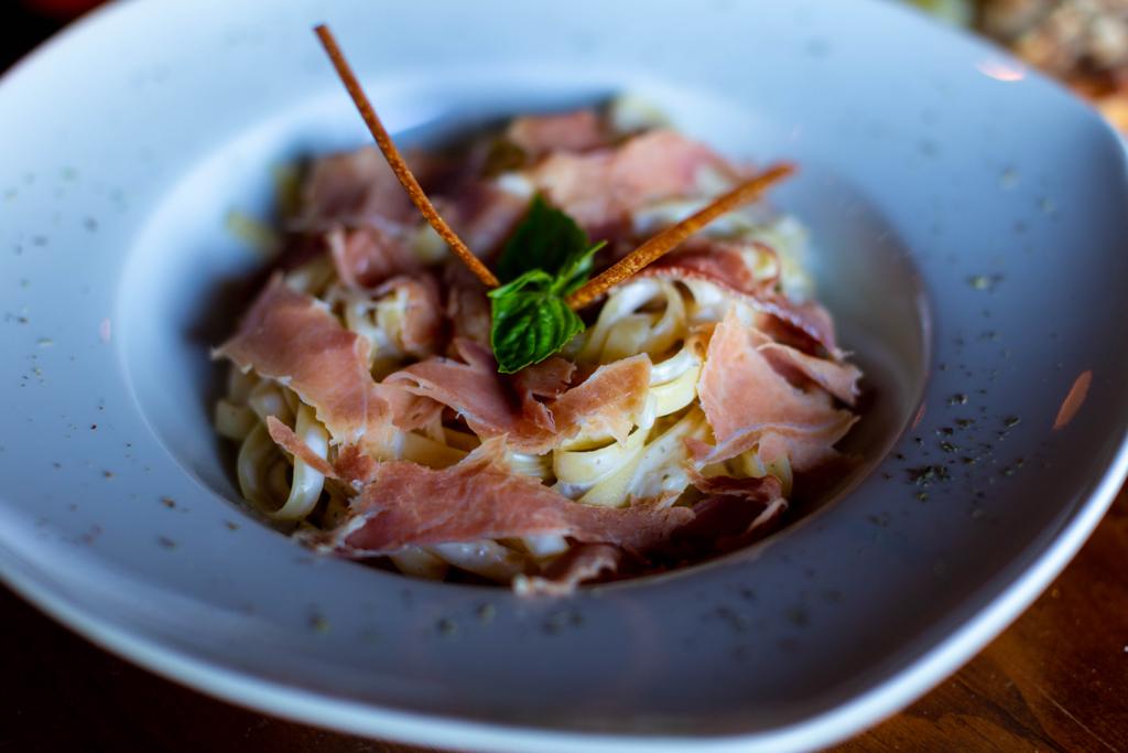 Cremosa preparación con hongos, aceite de oliva y queso parmesano, al final lajas de jamón serrano.