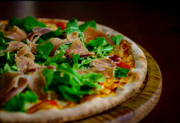 Pizza rustica con rodajas de jitomate cherry y al salir del horno decorado con lajas de jamón serrano y fresca arúgula.