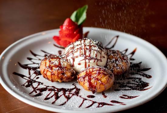 Cuatro galletas Oreo cubiertas y fritas servidas con chocolate y nieve de vainilla.