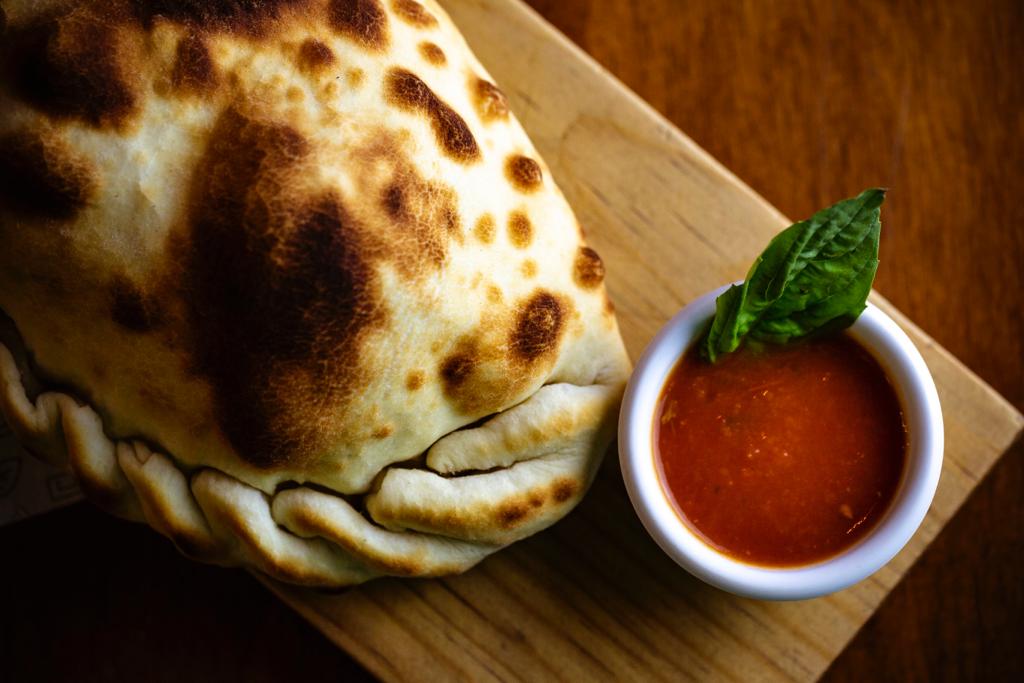 Calzone horneado relleno de jamón, champiñón, queso Mozzarella y queso cheddar.