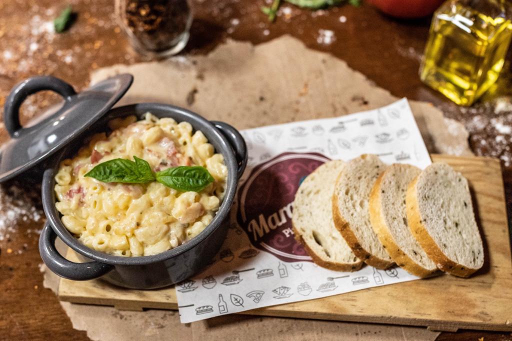 Cremosos macarrones preparados con queso cheddar, queso Mozzarella y tocino
