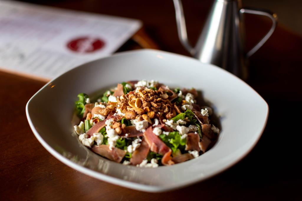 Lajas de jamón serrano, trocitos de queso de cabra y dulces cacahuates garapiñados montados sobre una cama de arúgula y lechuga romana.