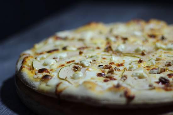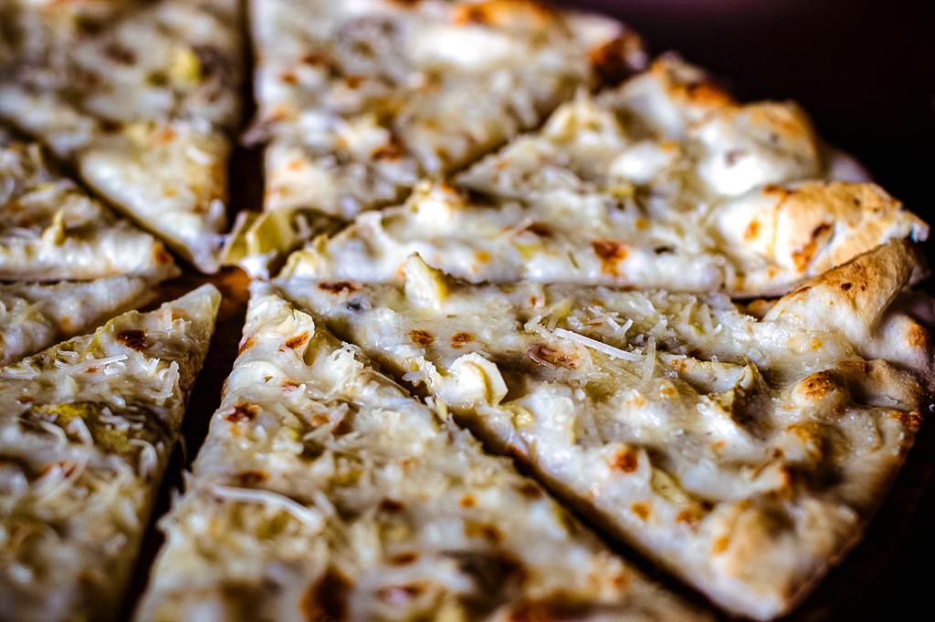Pizza con salsa blanca cremosa, corazones de alcachofa, queso Mozzarella y queso parmesano.