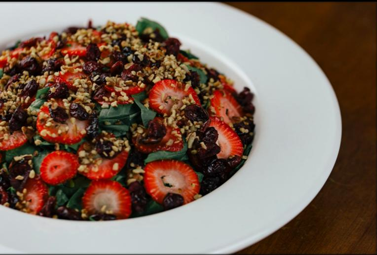 Clásica ensalada con fruta de temporada, arándanos deshidratados y nuez. Todo esto sobre frescas lechugas y espinacas.