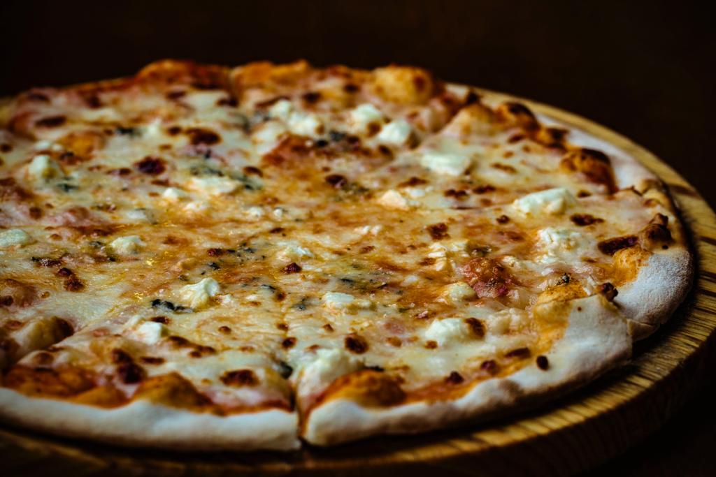 Mezcla de cuatro quesos, queso Gorgonzola, queso de cabra, queso parmesano y queso Mozzarella.