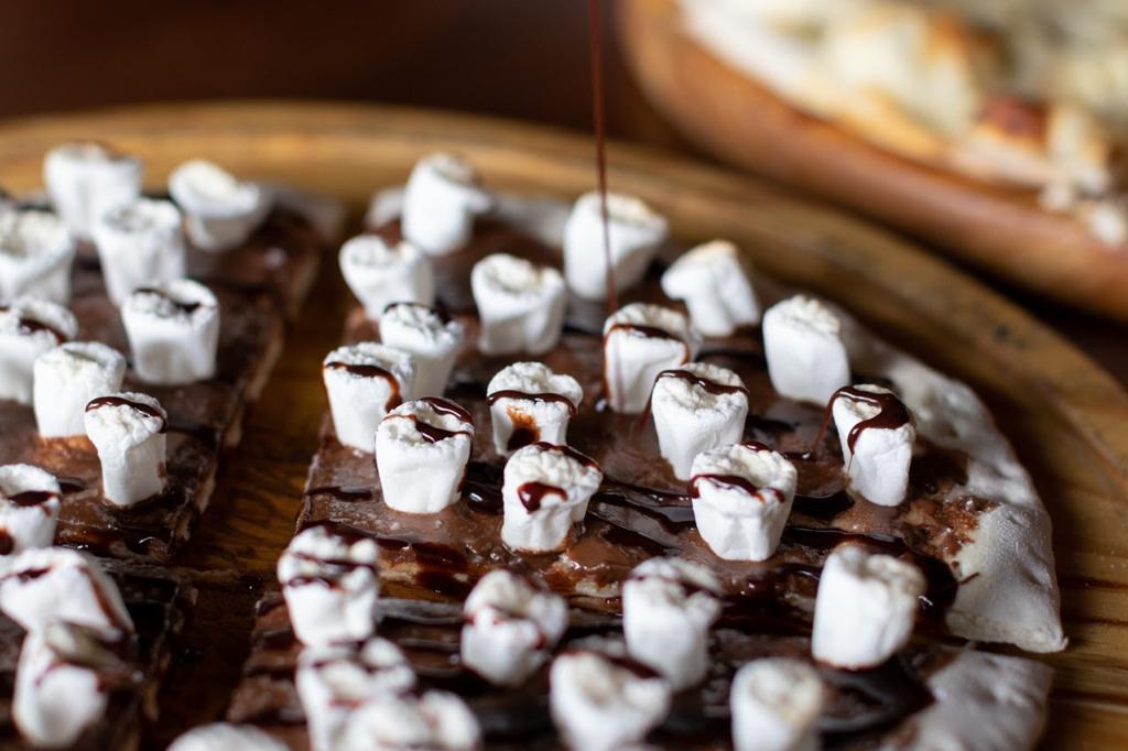 Pan pizza cubierta con Nutella, chocolate y malvavisco a la leña.