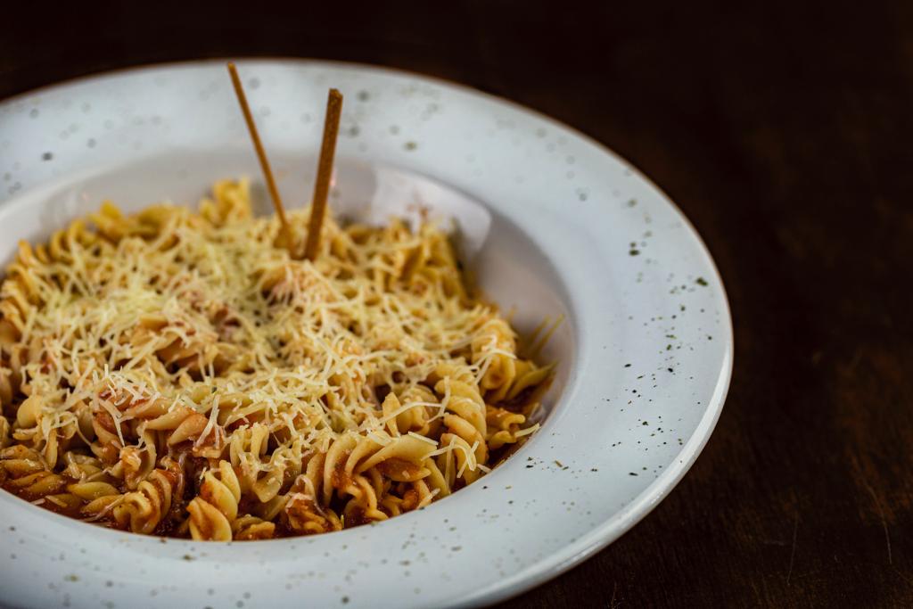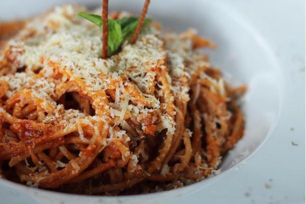 La clásica salsa de tomate y albahaca cubierta con queso parmesano recién rallado.