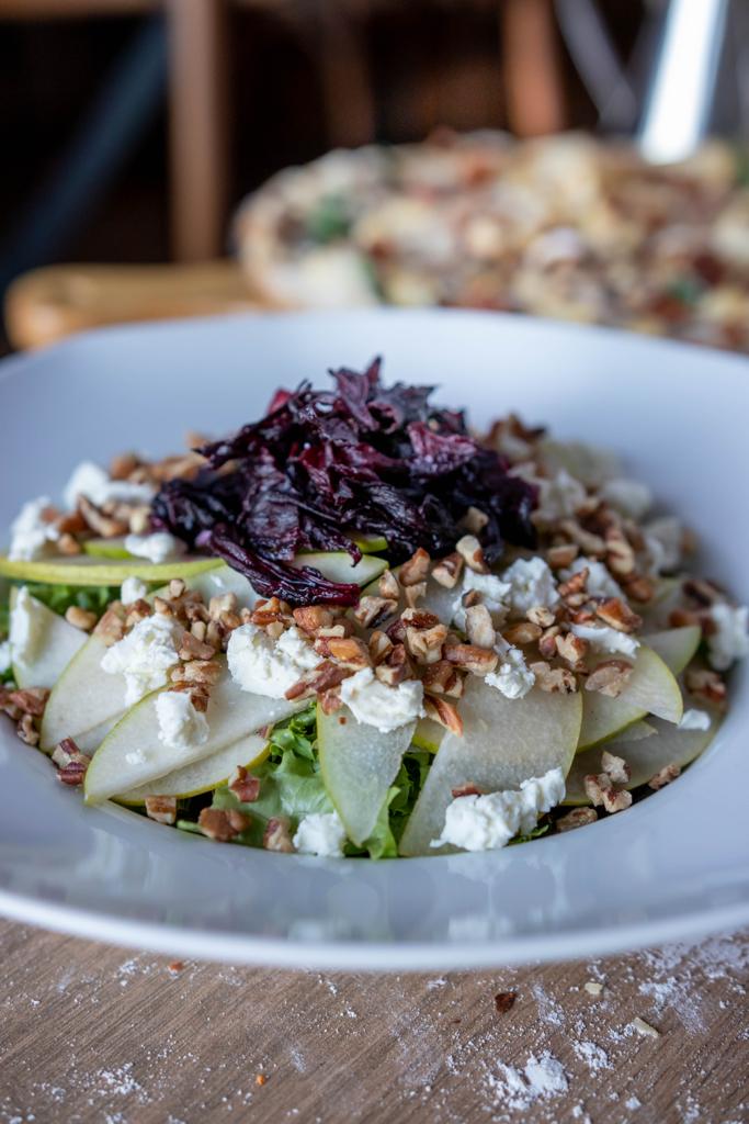 Cama de lechuga romana, medias lunas de pera, trozos de queso de cabra y al final flor de jamaica al vino tinto con nuez.