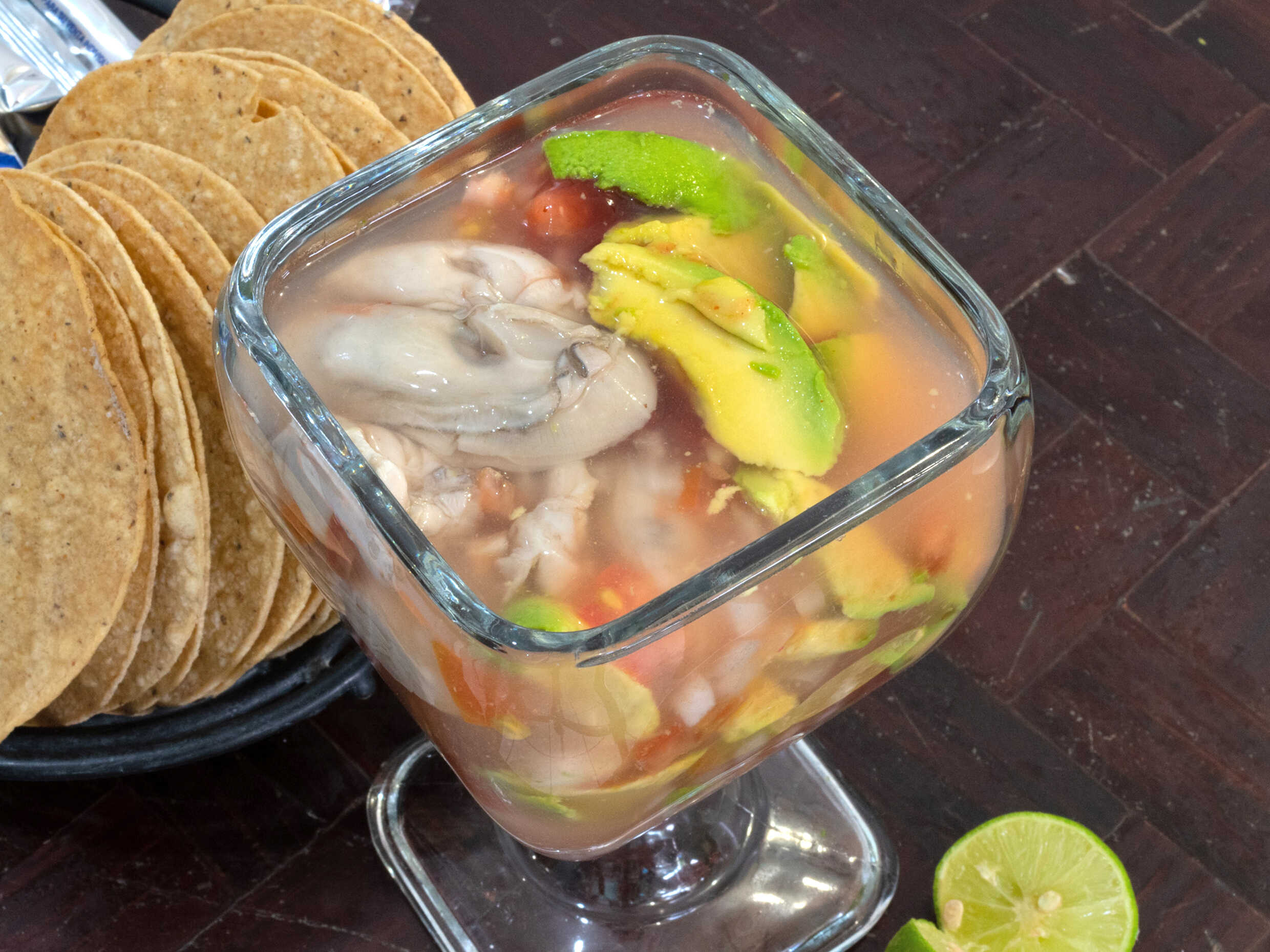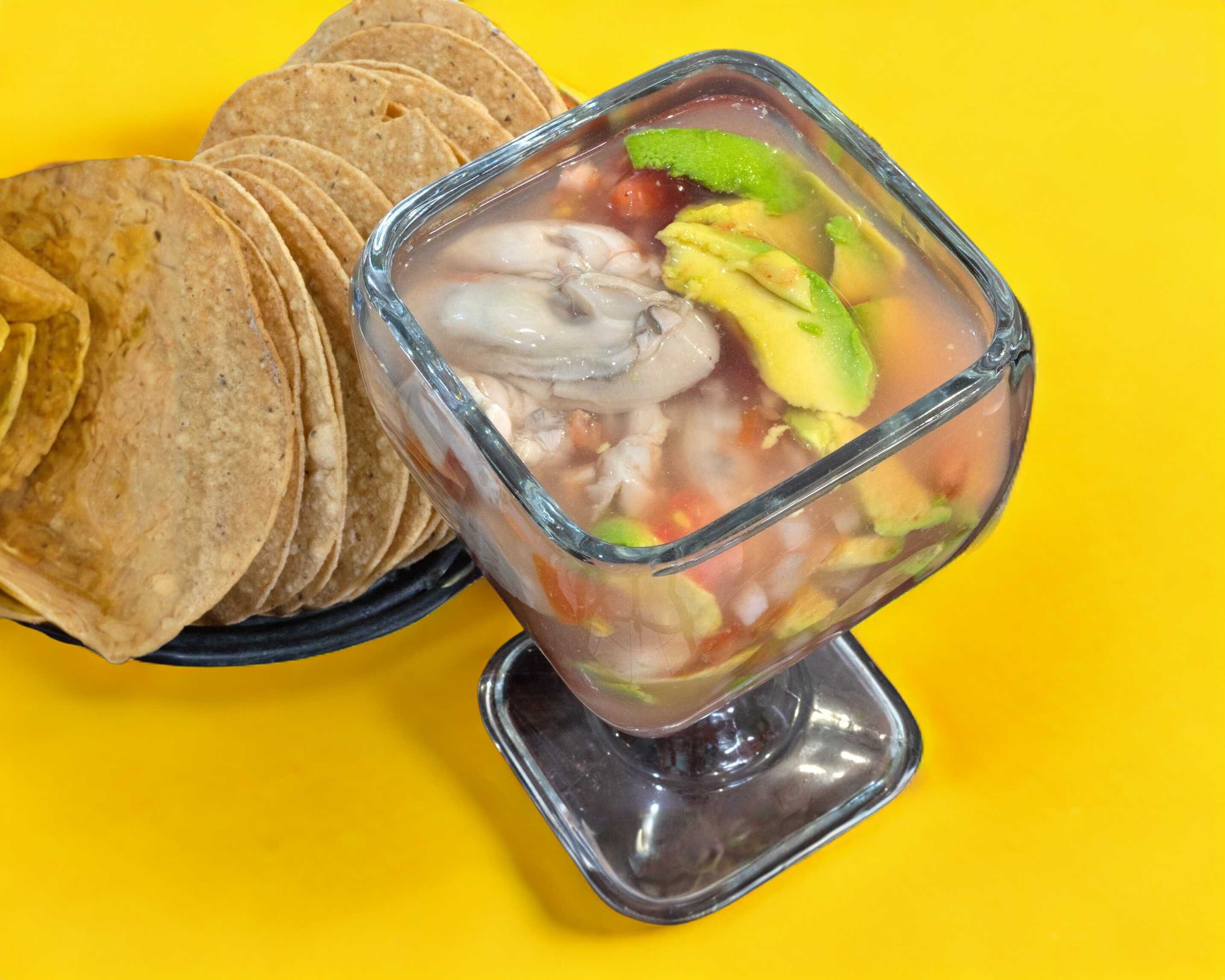 Camarón, pulpo, pecado, ostión, acompañado con chile verde, cebolla, cilantro y aguacate.