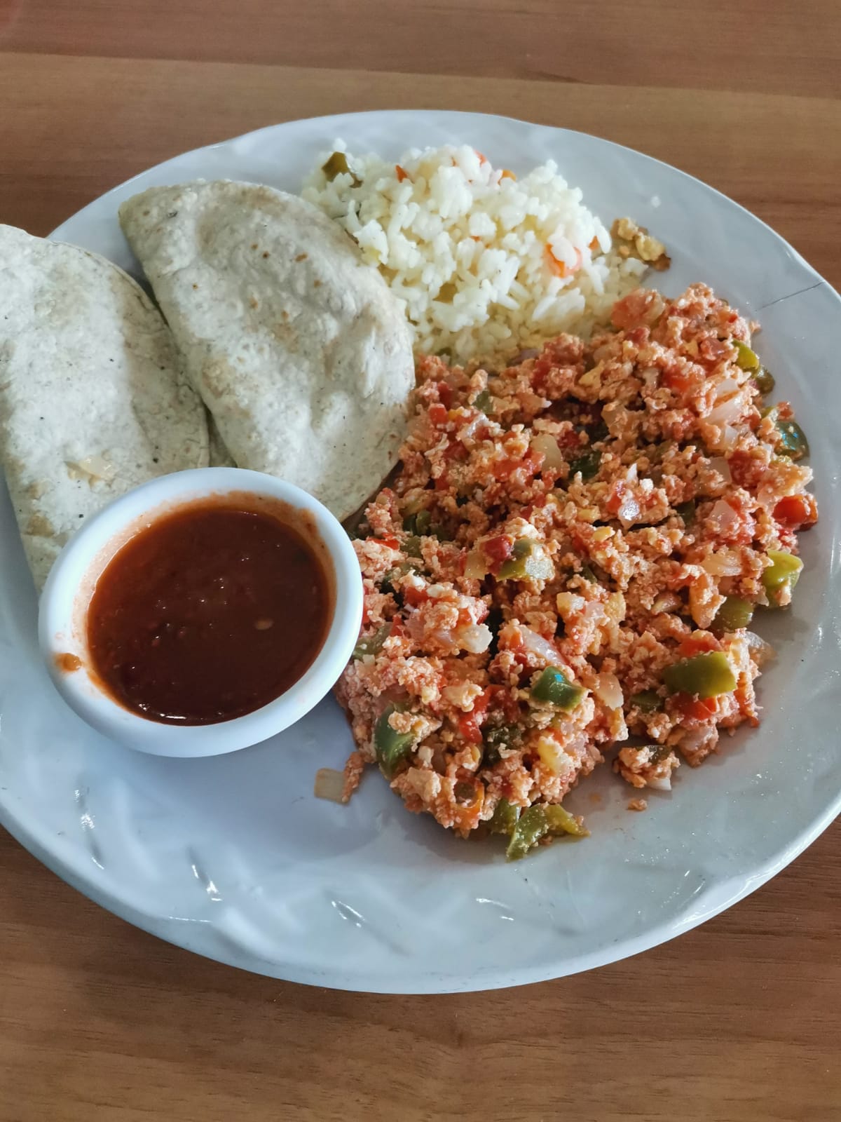 3 Huevos con jitomate, cebolla y chile verde, 2 quesadillas de maíz, arroz blanco y salsa de jitomate.