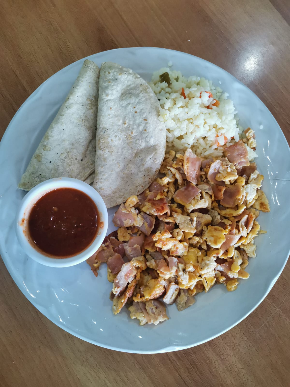 3 Huevos arroz blanco, 2 quesadillas y salsa de jitomate.