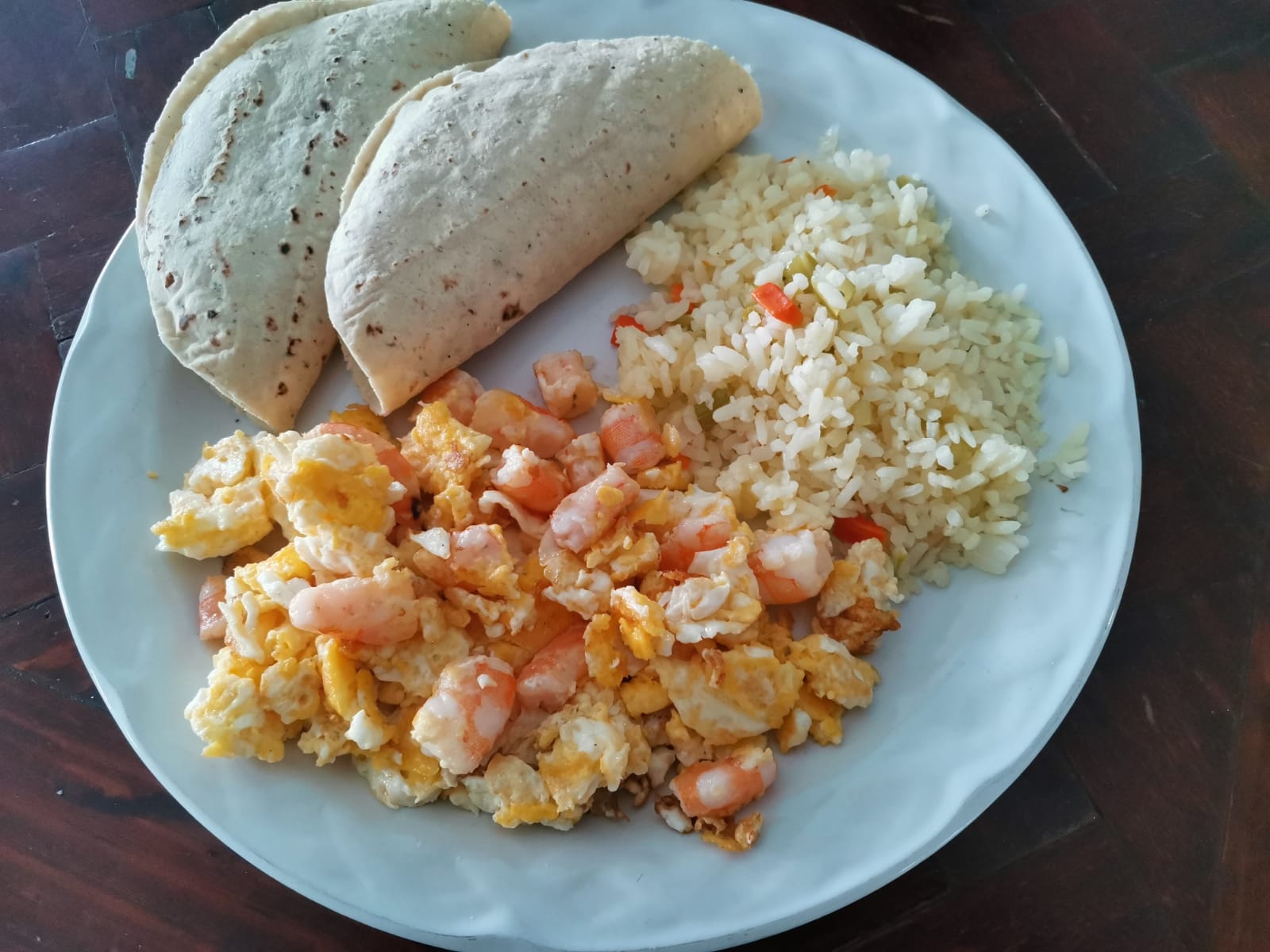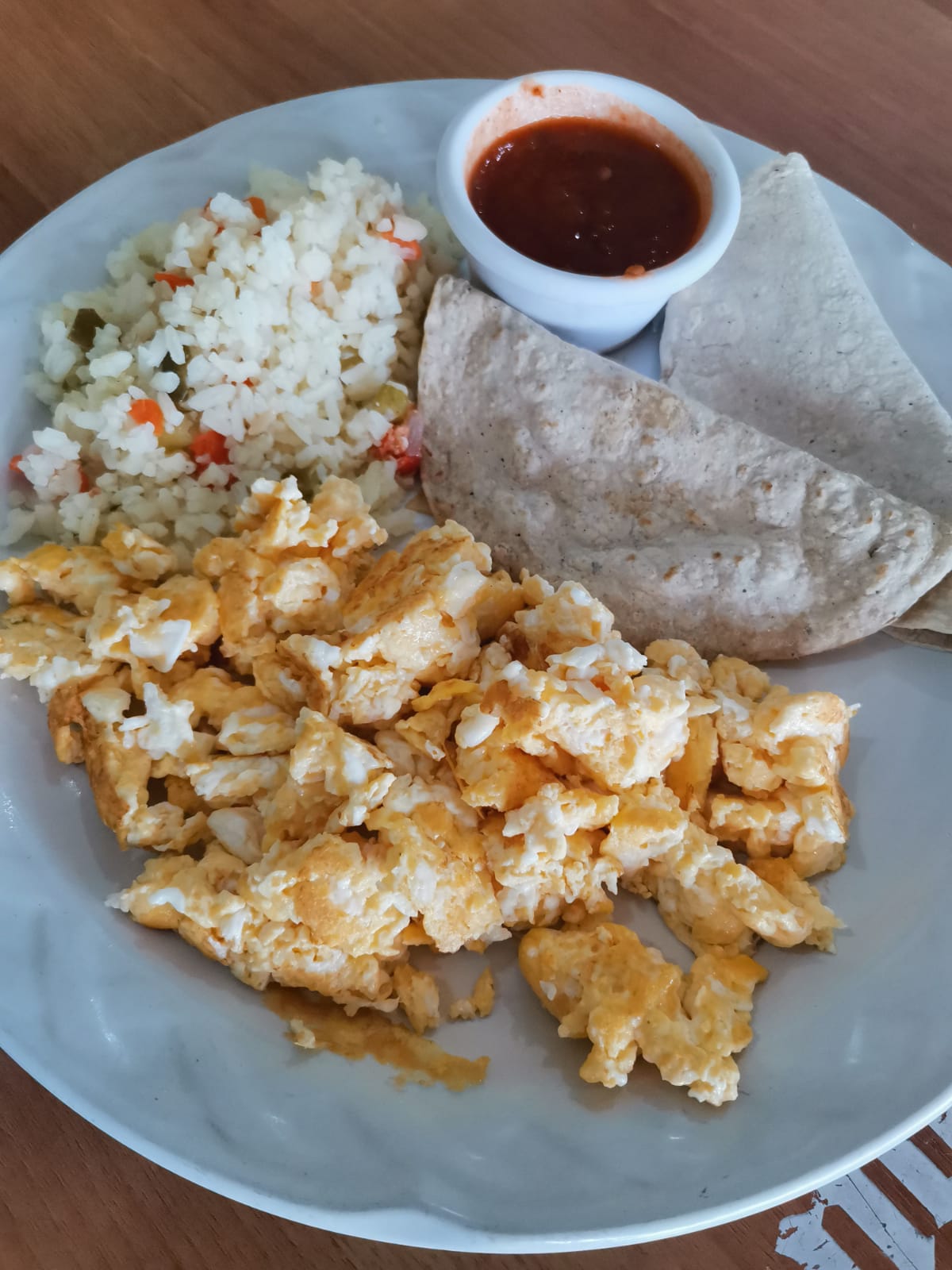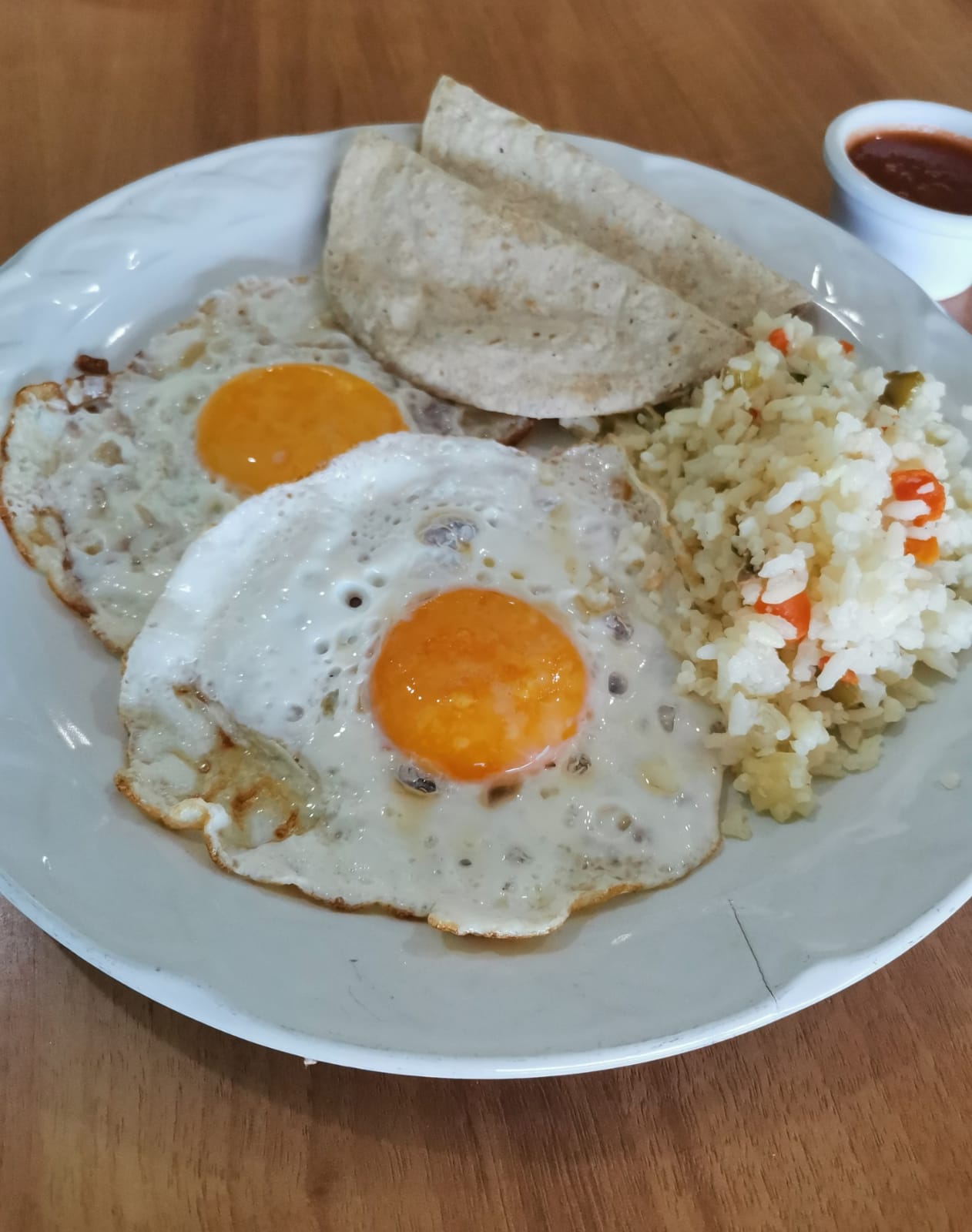 3 Huevos, arroz, 2 quesadillas de maíz, arroz blanco y salsa de jitomate.