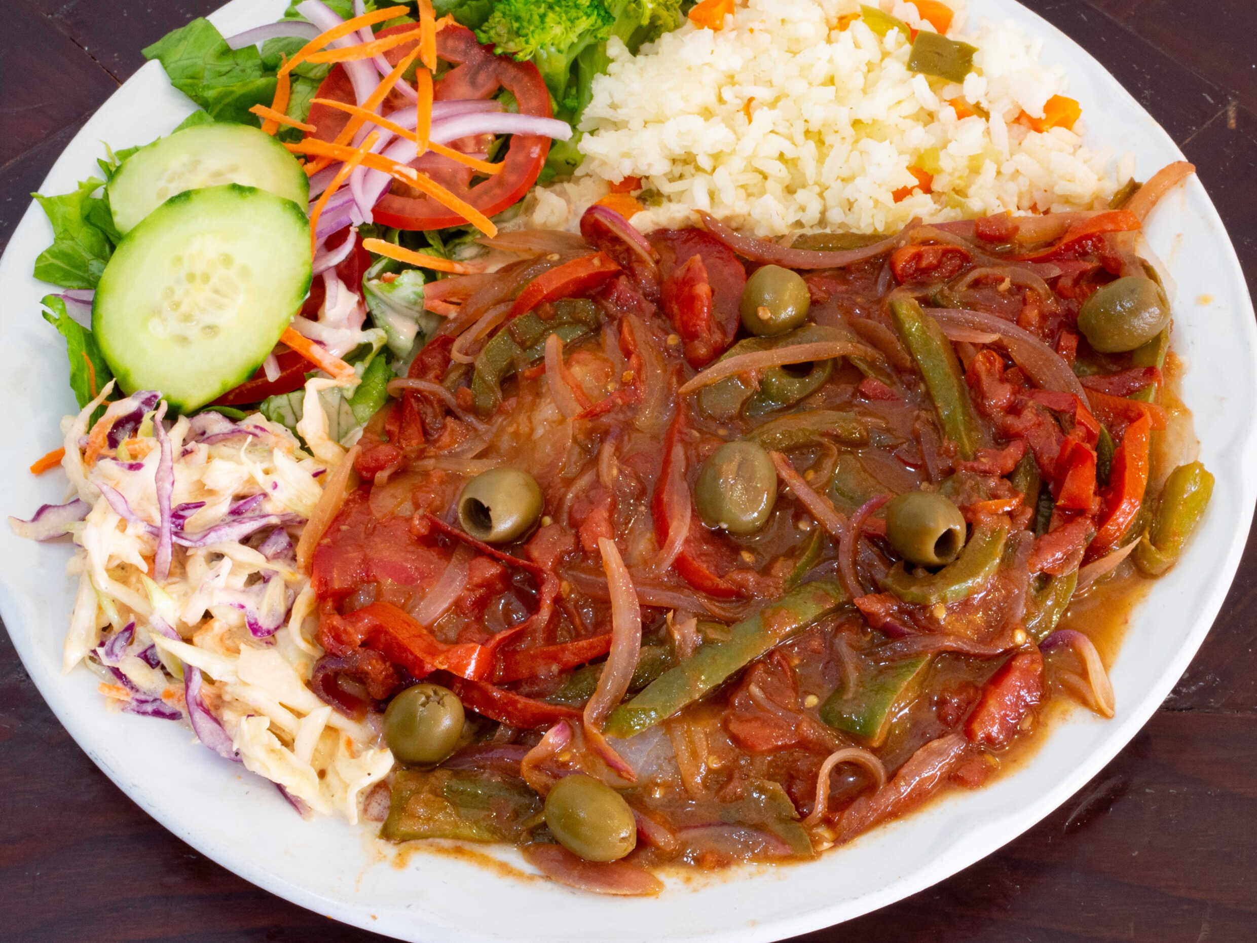 Guisado chile morrón, cebolla jitomate, aceitunas, es una salsa preparada, acompañado de ensalada dulce, arroz blanco y ensalada fresca.