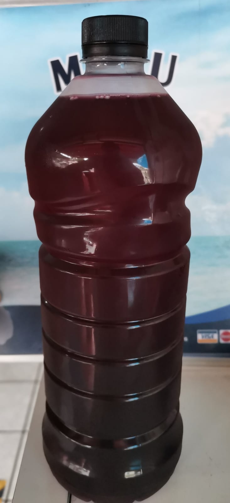 1 Litro, salsa negra, sal, limón, caldo de camarón, clamato, hielo, cerveza, arriba se le pone pepino y 3 camarones y se baña con una salsa tipo chamoy.