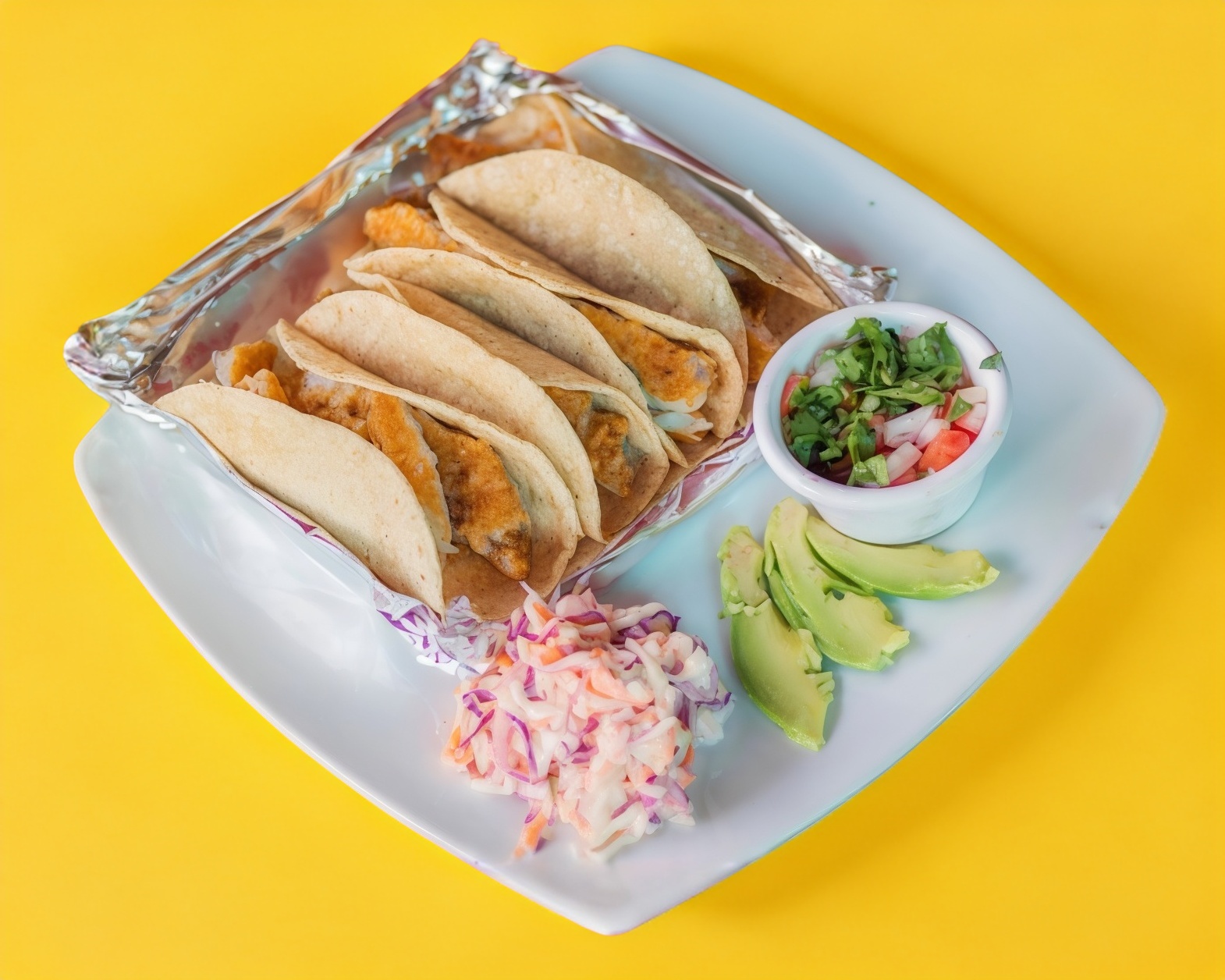 4 tacos rellenos de aproximadamente de 60 GR de pescado,salsa dulce,jitomate y salsa mexicana(pico de gallo).