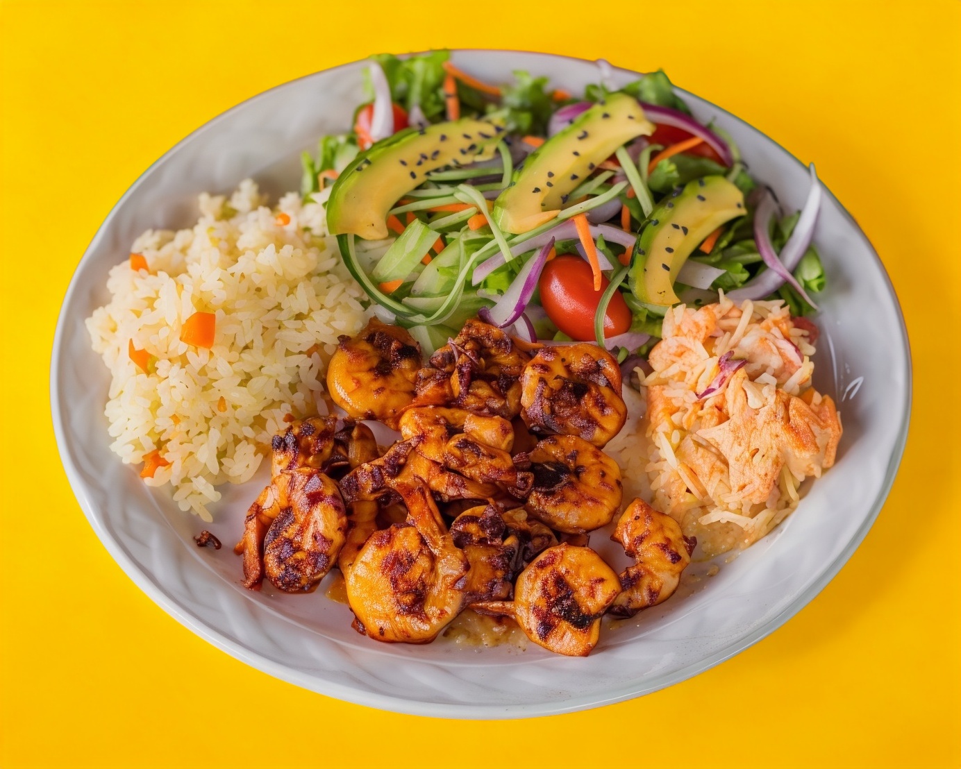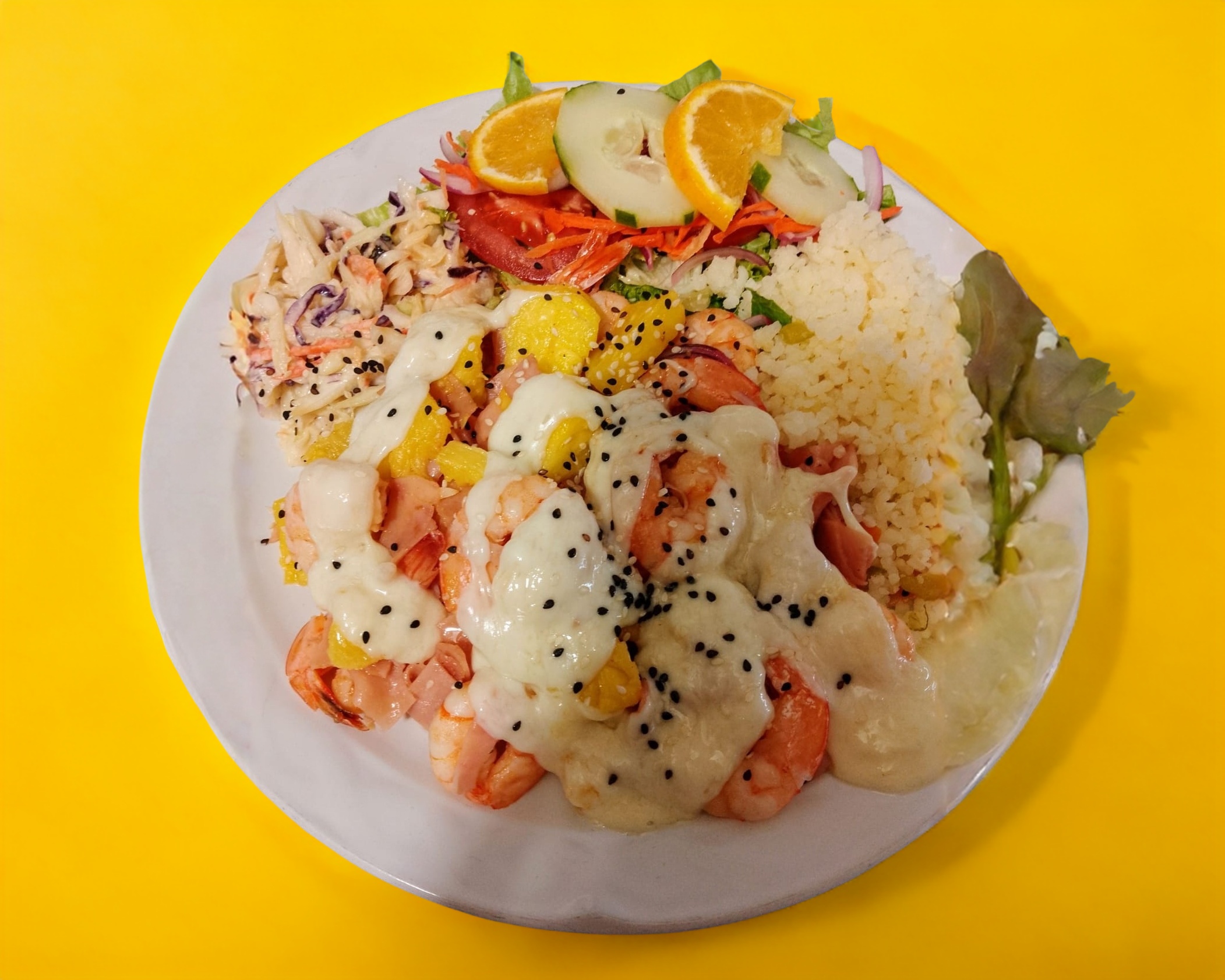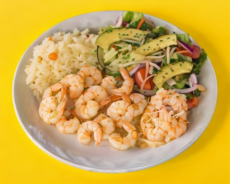 120gramos de camaron Acompañado de ensalada dulce, arroz blanco y ensalada fresca.