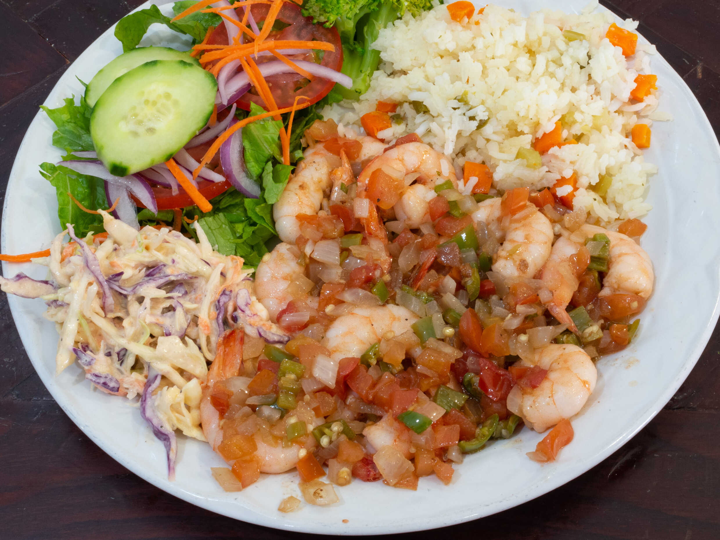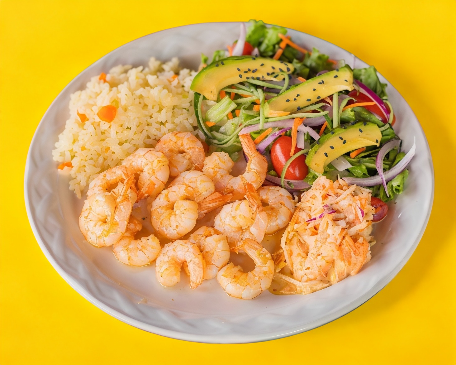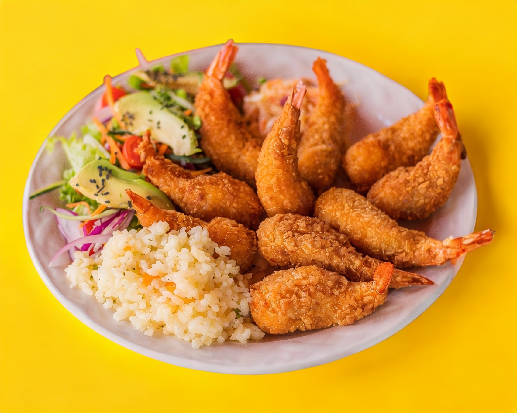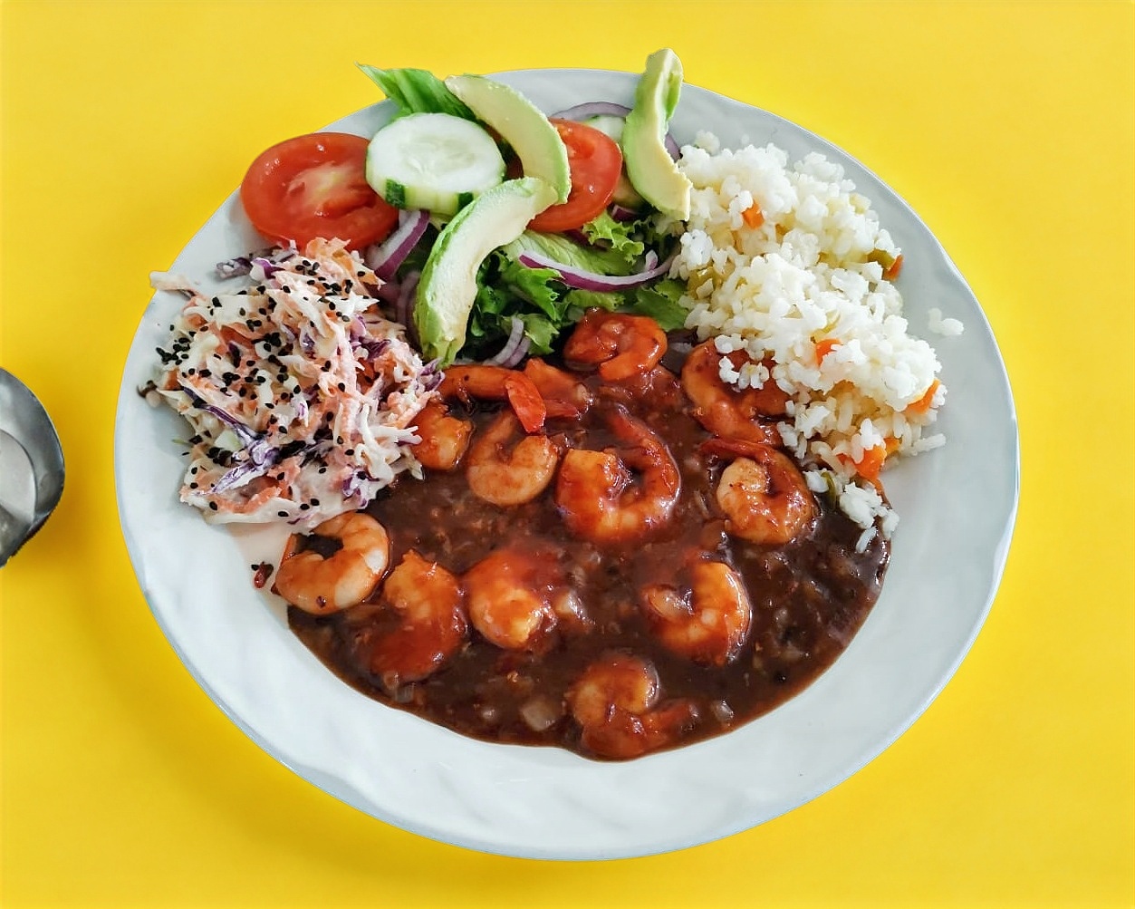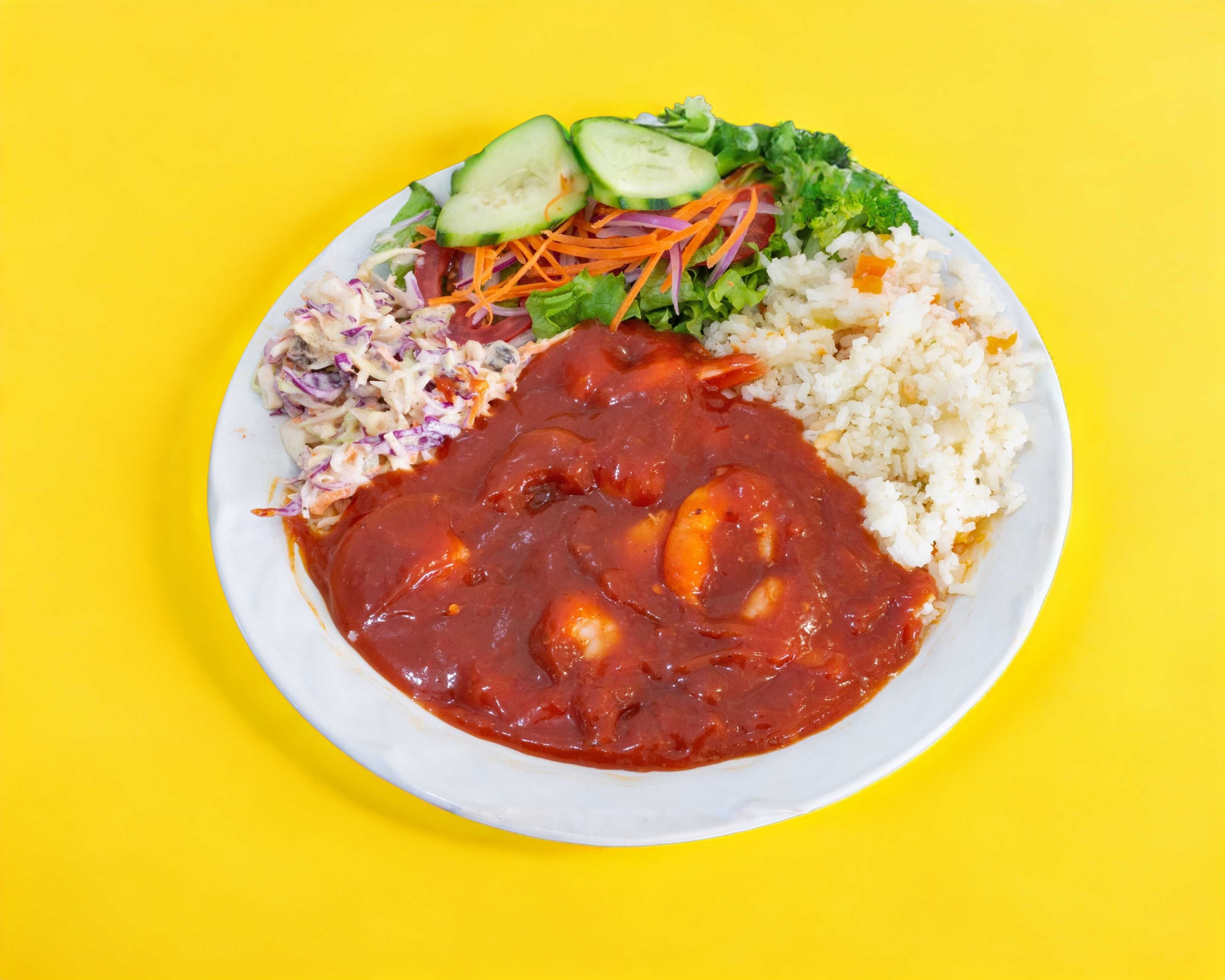 Acompañado de ensalada dulce, arroz blanco, ensalada fresca y 10 camarones.