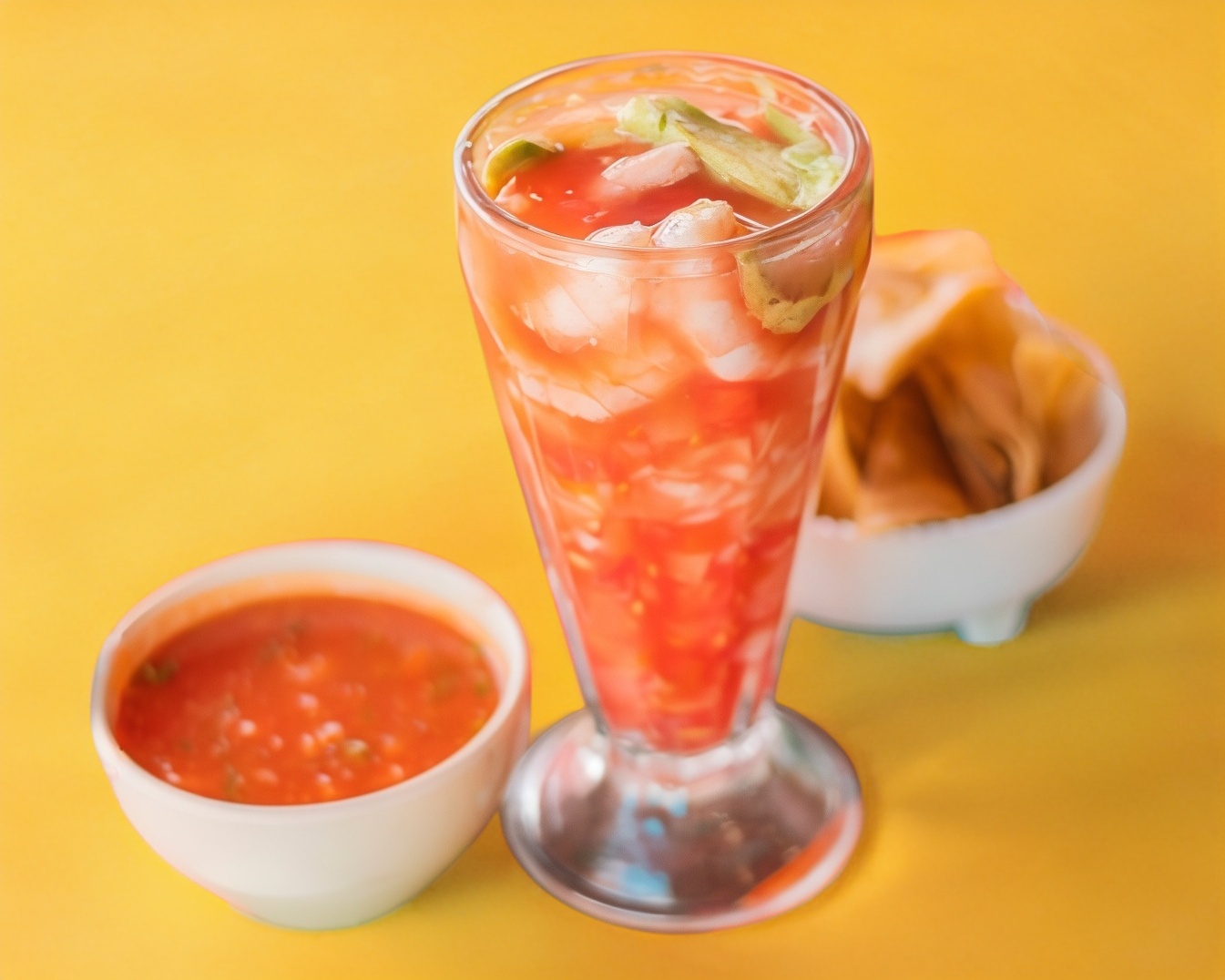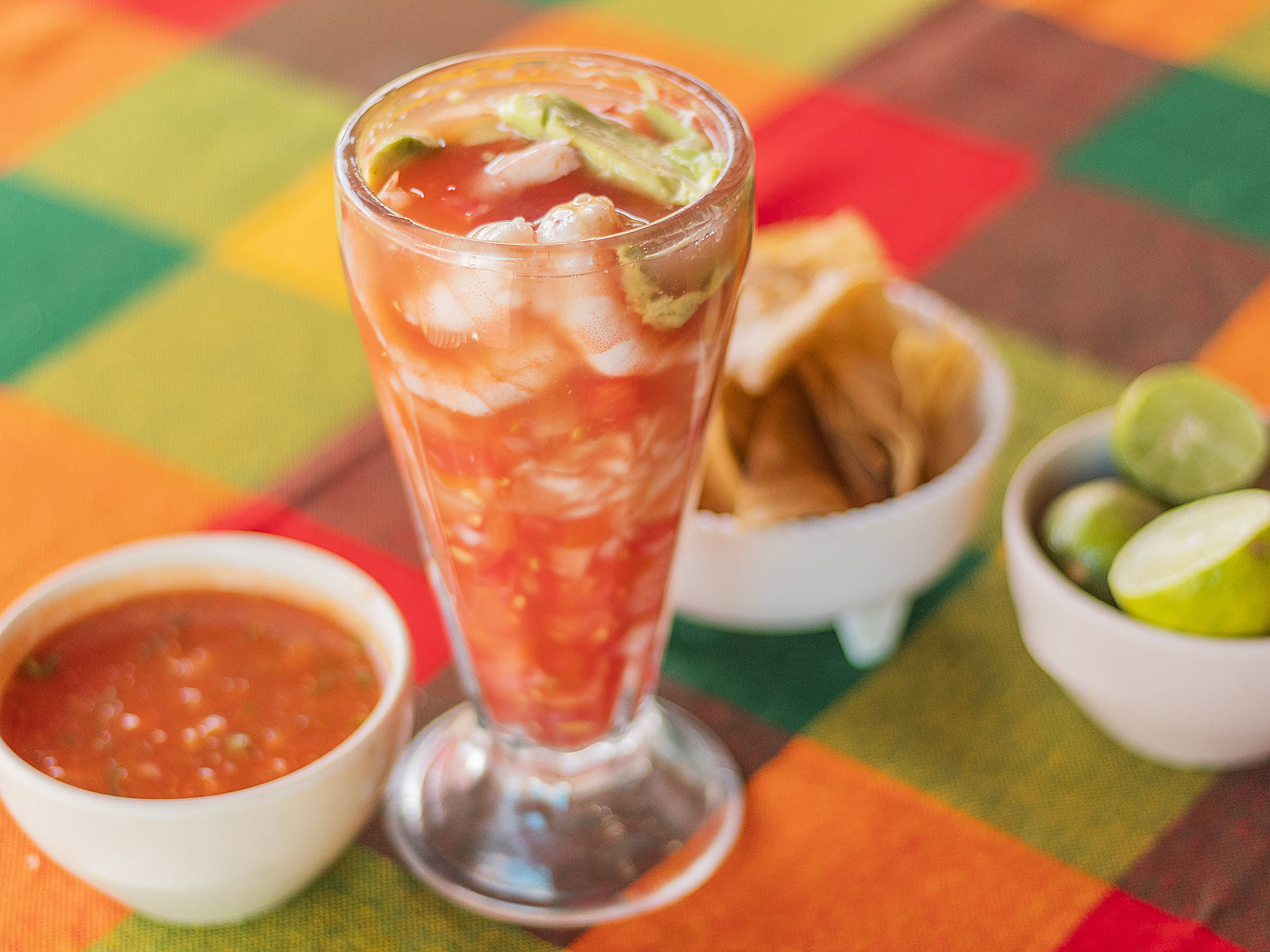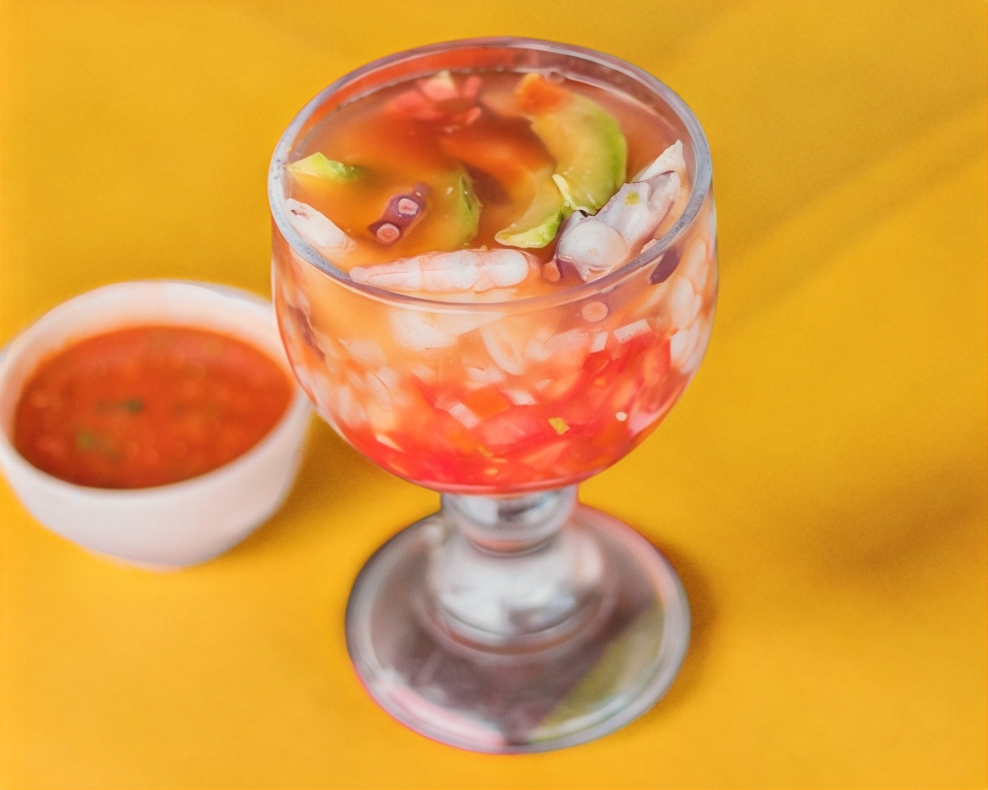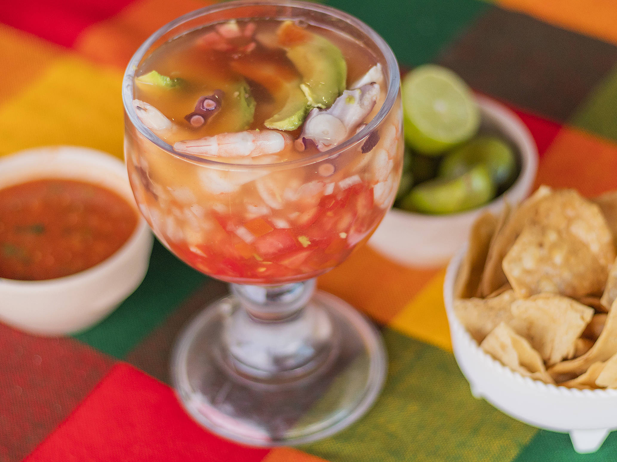 Camarón, pulpo, ceviche de camarón, aguacate, salsas negras y Clamato, 4 tostada y 2 galletas picante.