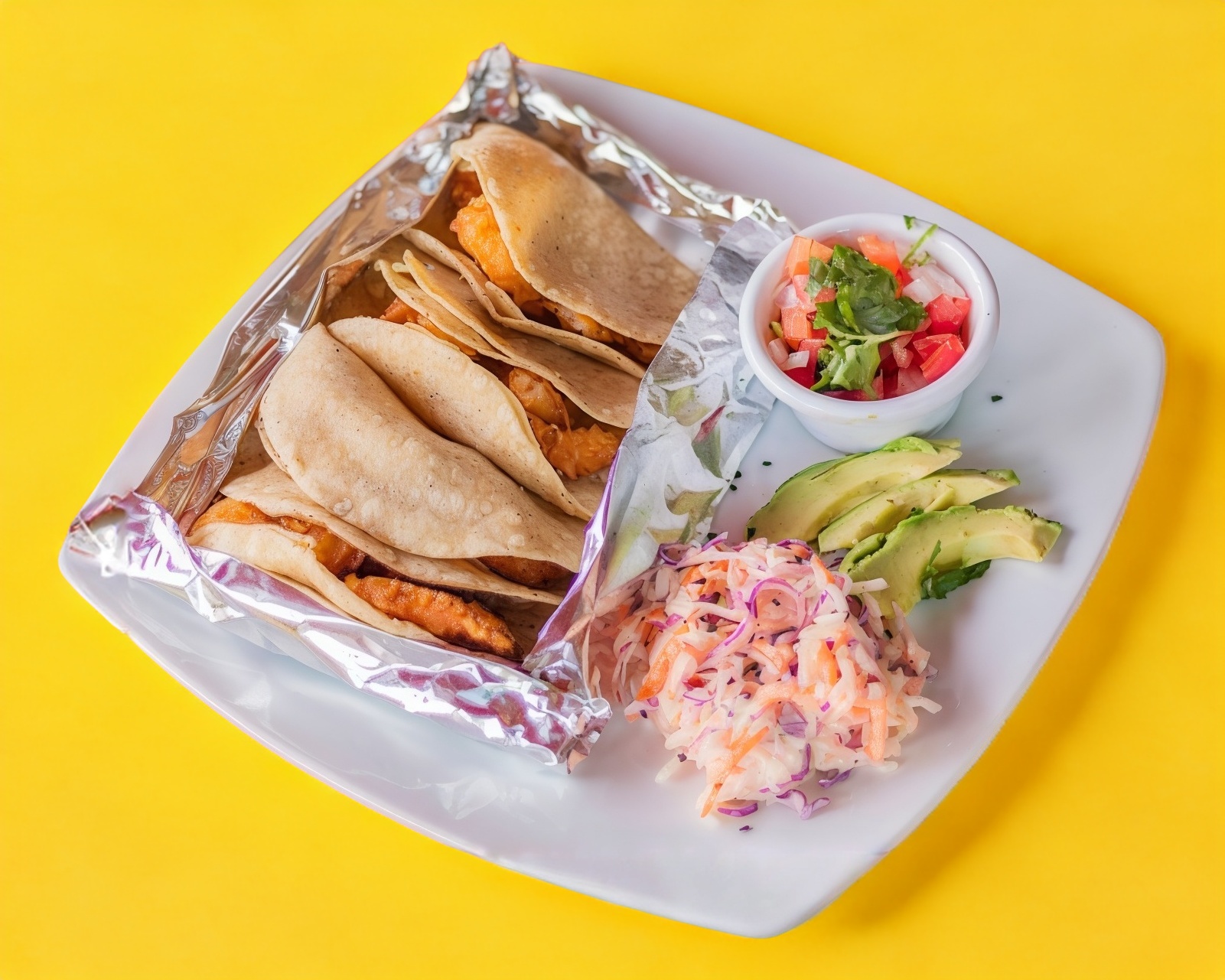 Orden con 3 piezas, salsa mexicana, chile y ensalada dulce.