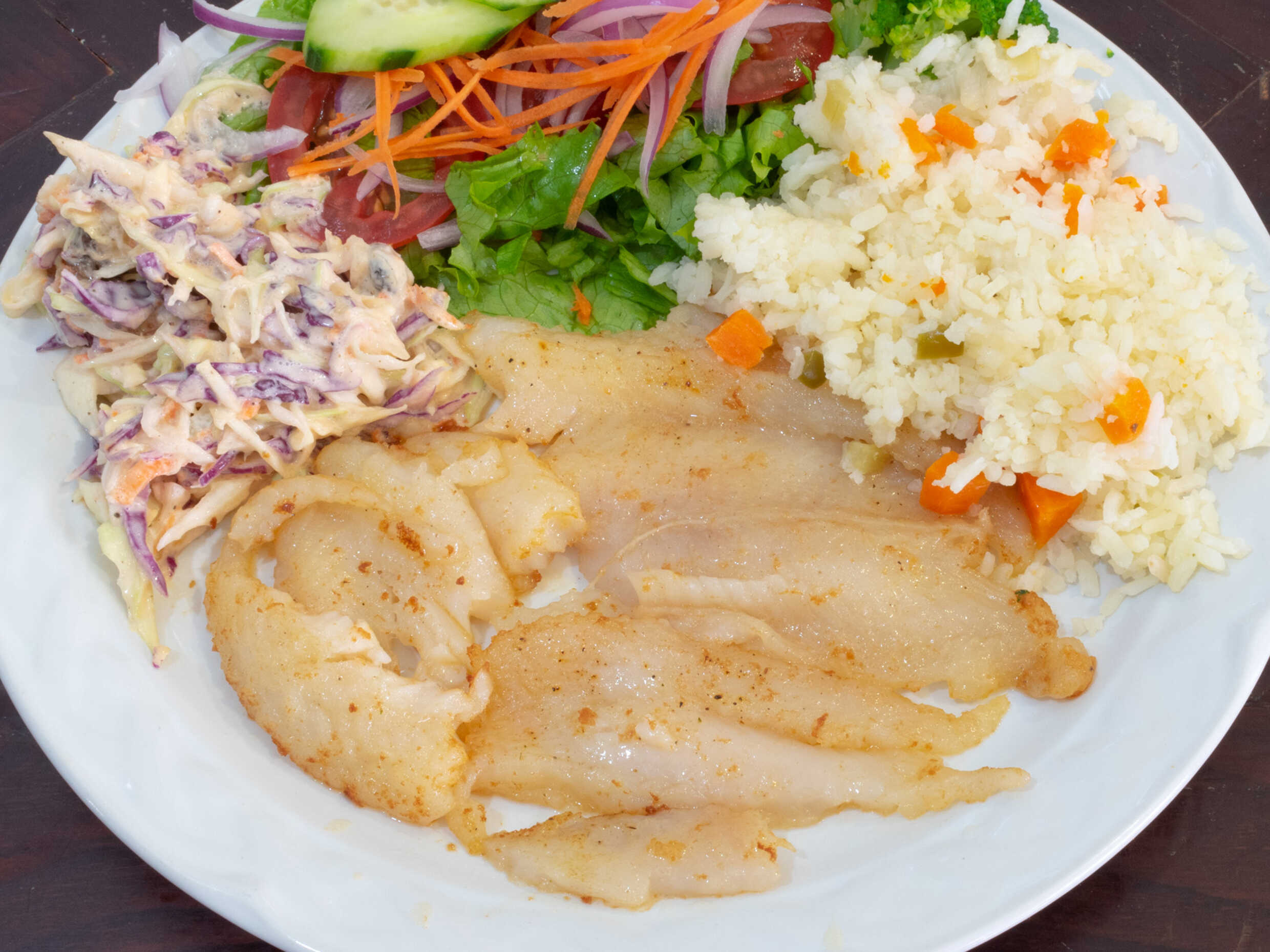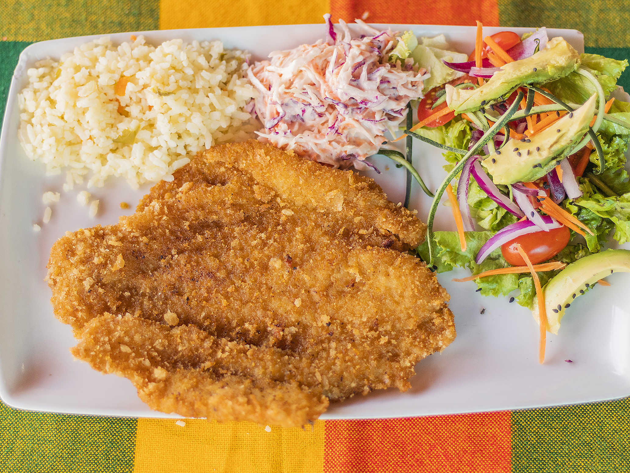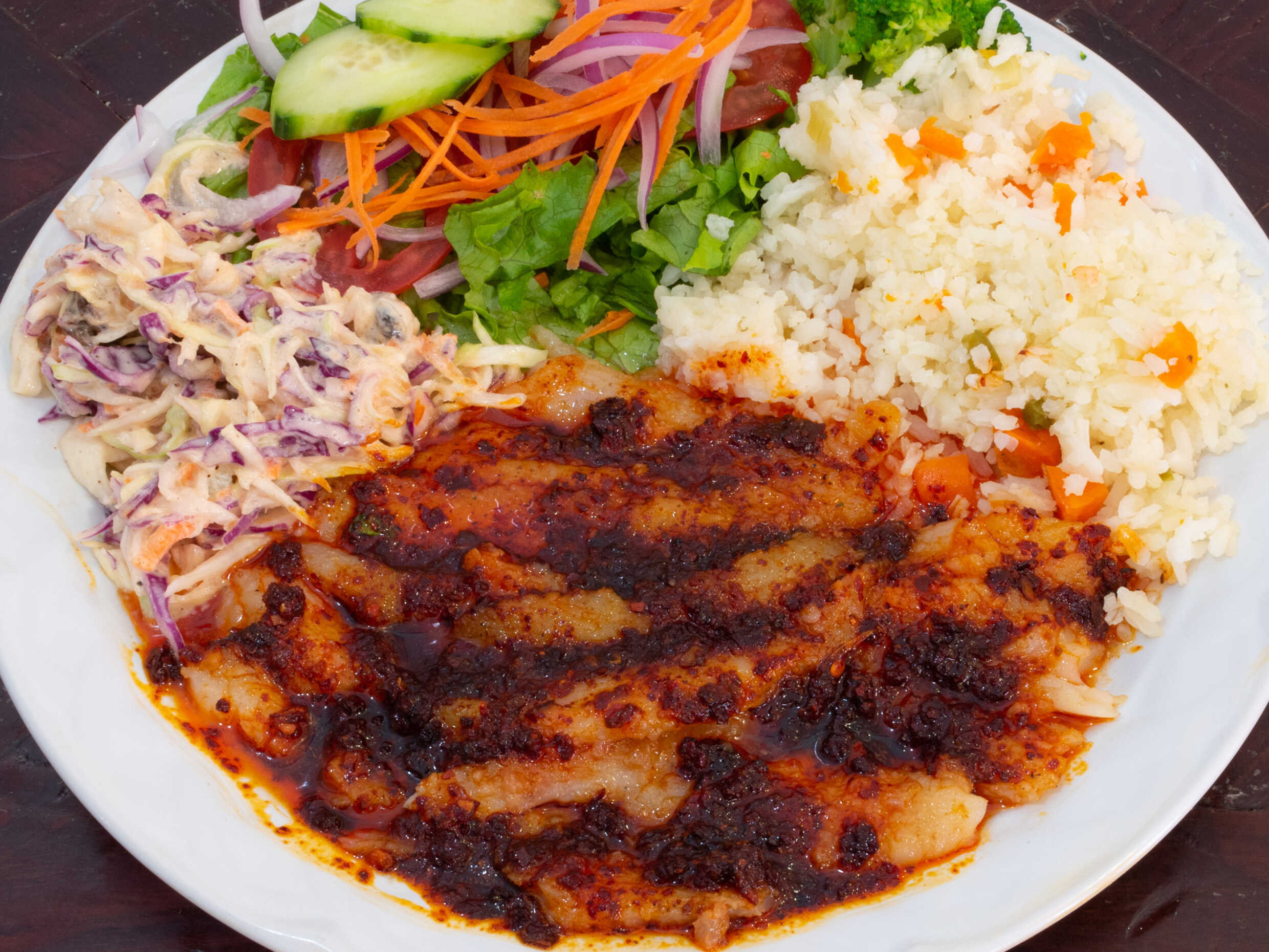 Acompañado de ensalada dulce, arroz blanco, ensalada fresca .y salsa de tamarindo.