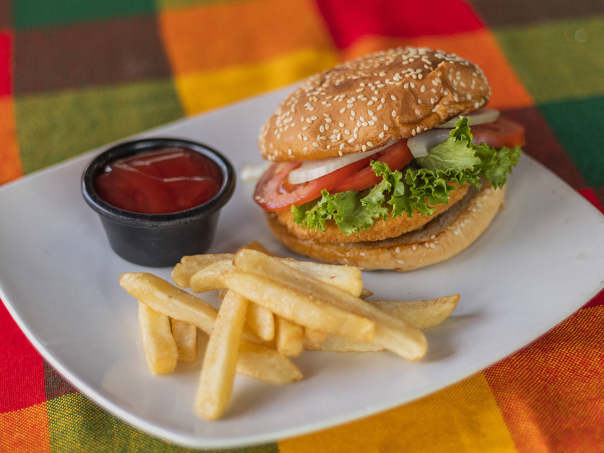 Jitomate, cebolla, lechuga, queso amarillo y papas a la francesa.