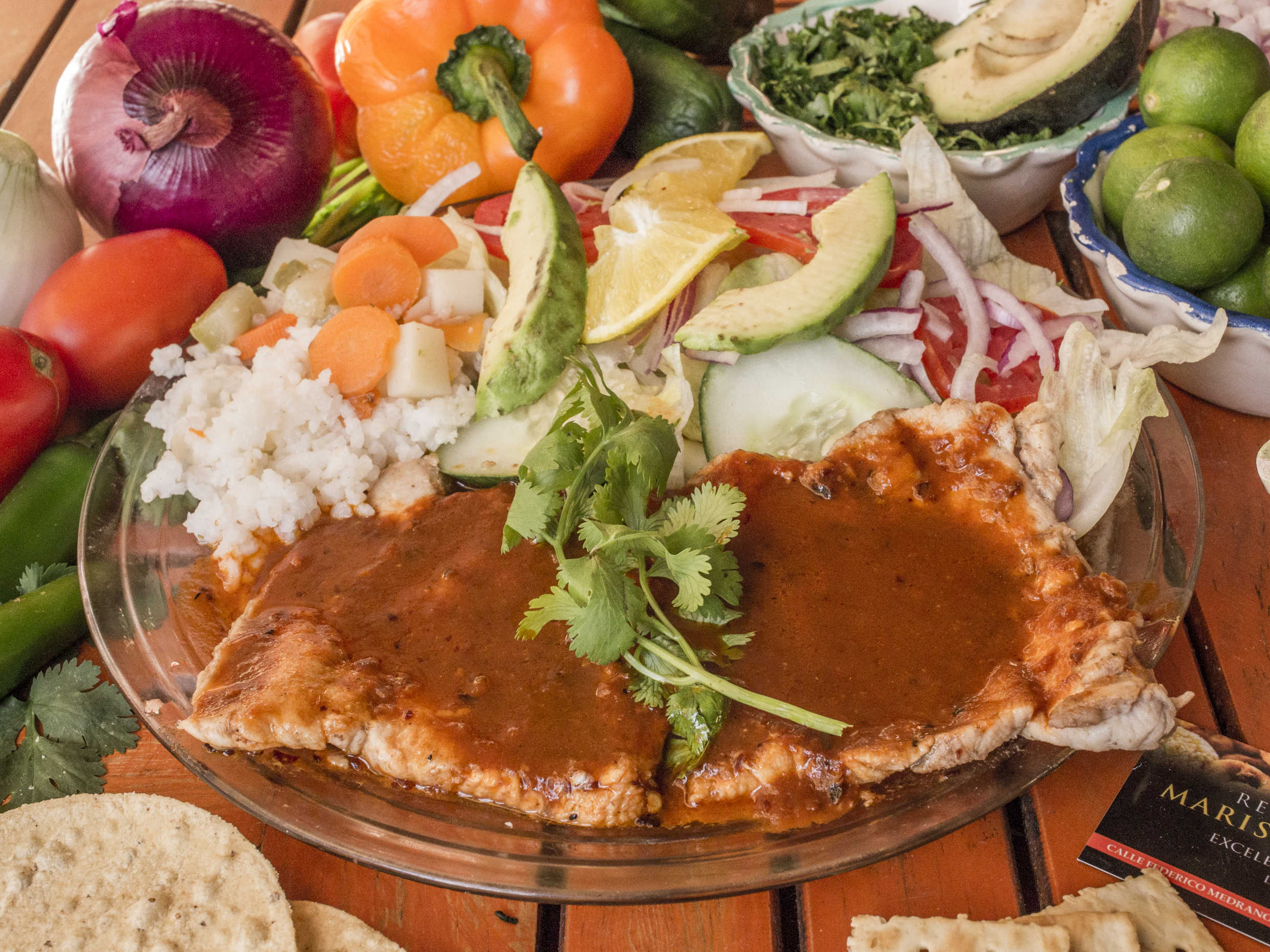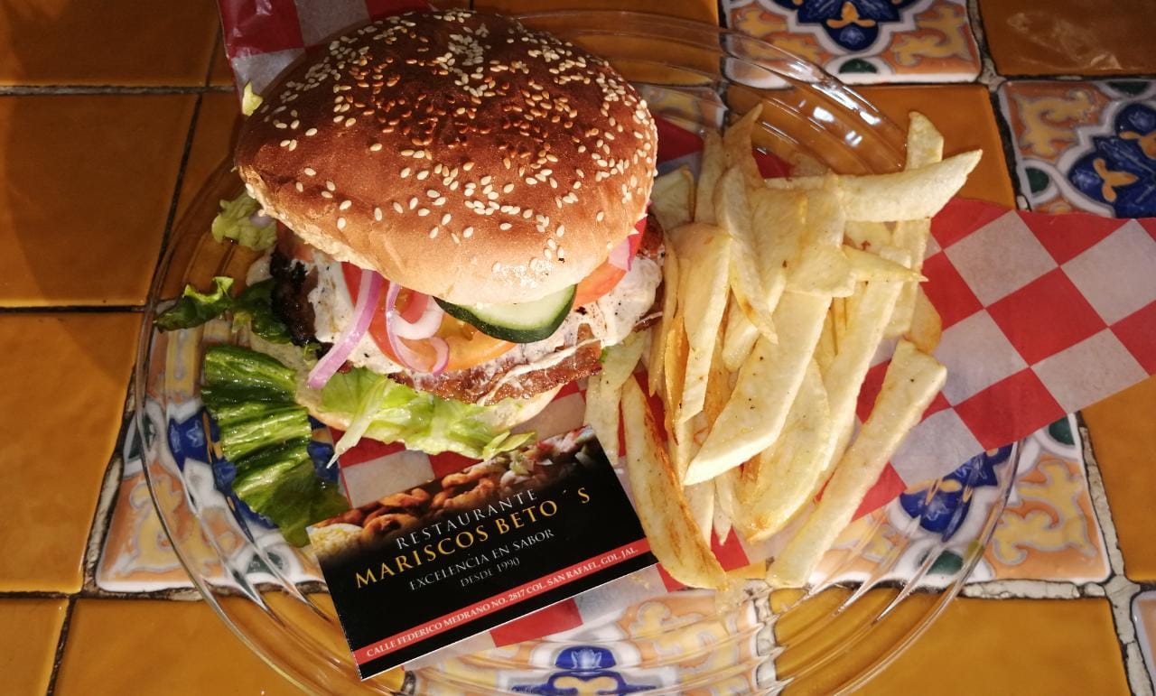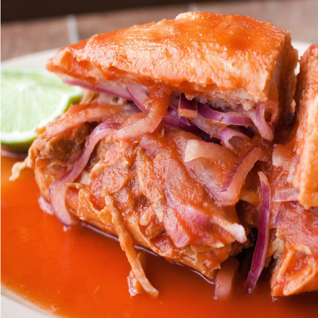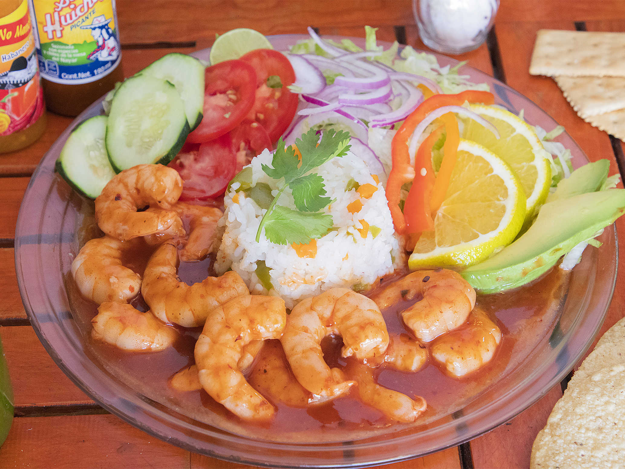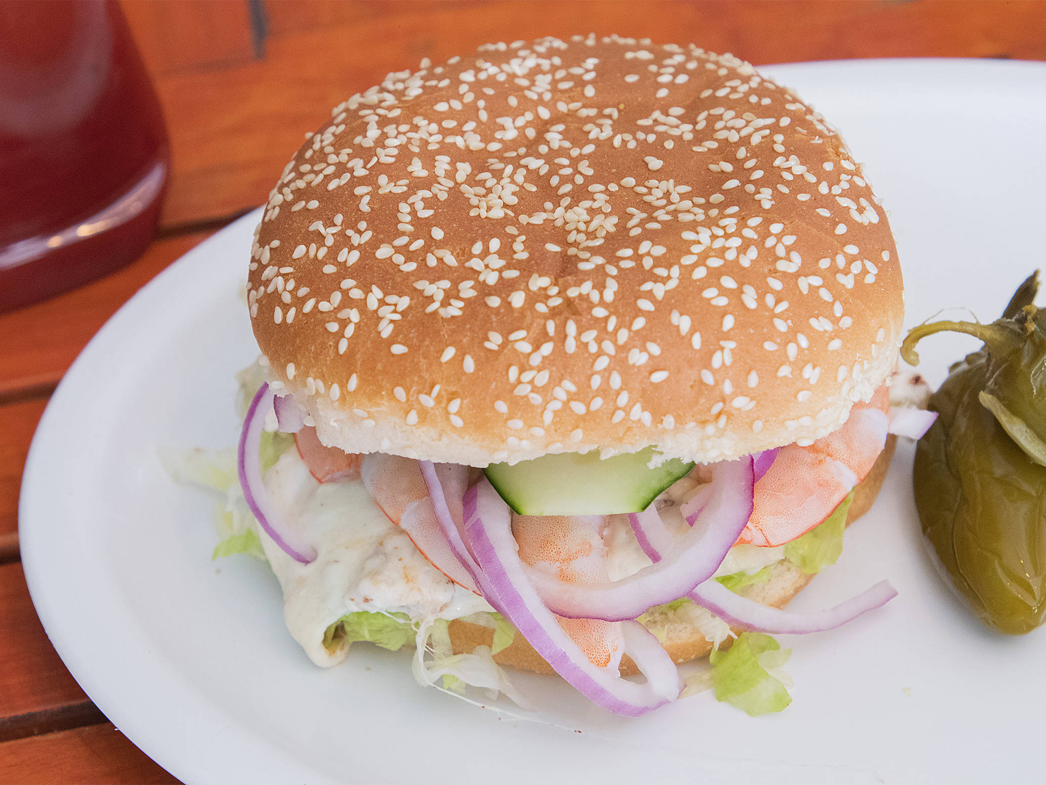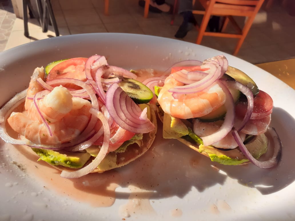 Birote salado bañado con aderezo al chipotle o salsa tradicional acompañado de tiras de cebolla, relleno de aguacate y camarón.