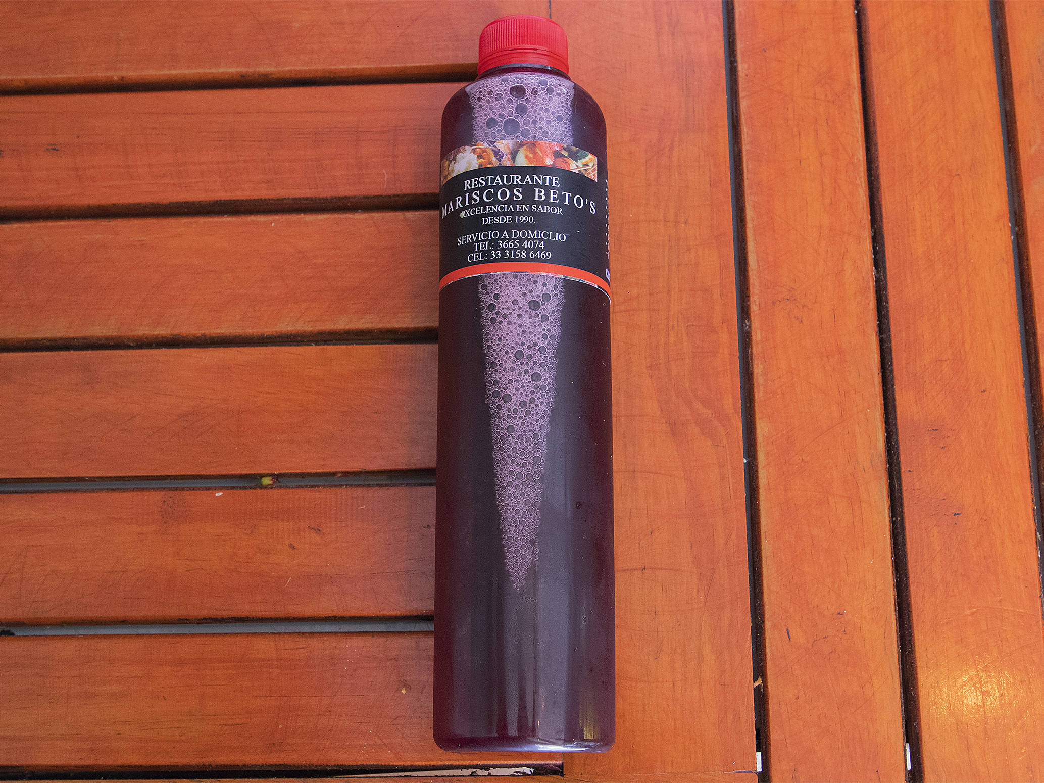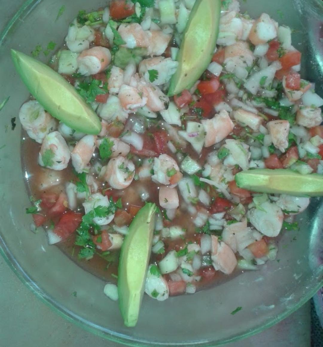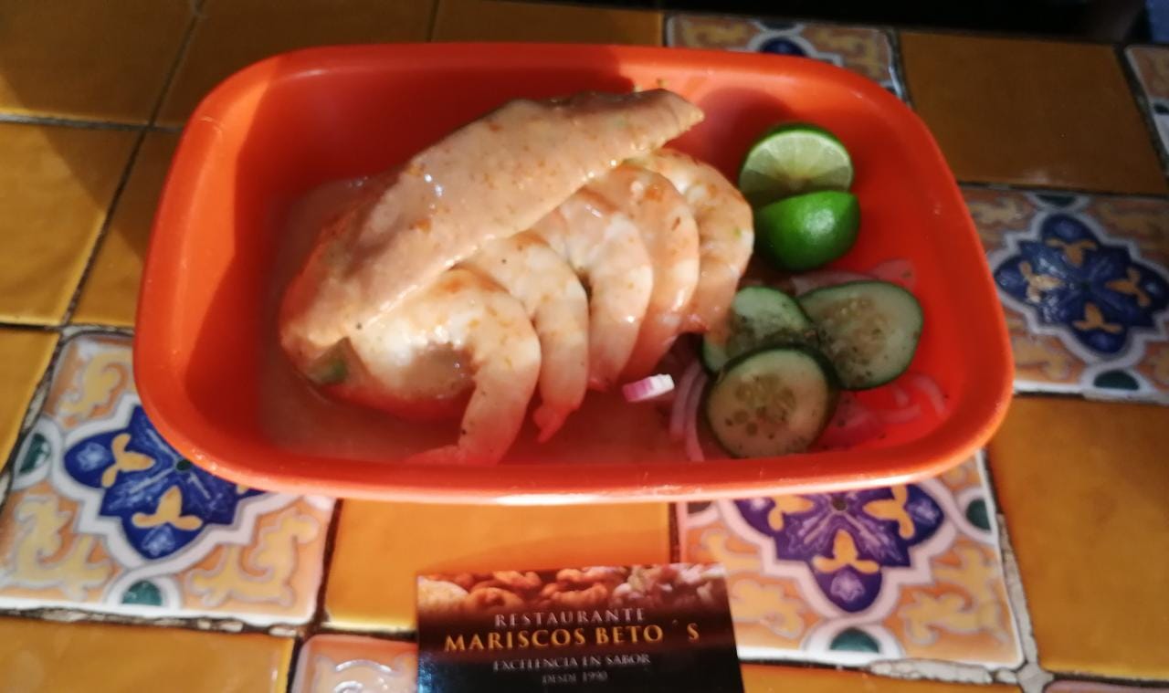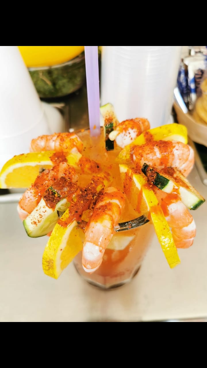 Lleva cerveza ,salsas ,clamato y 6 camarones y pepinos con sal y limón .