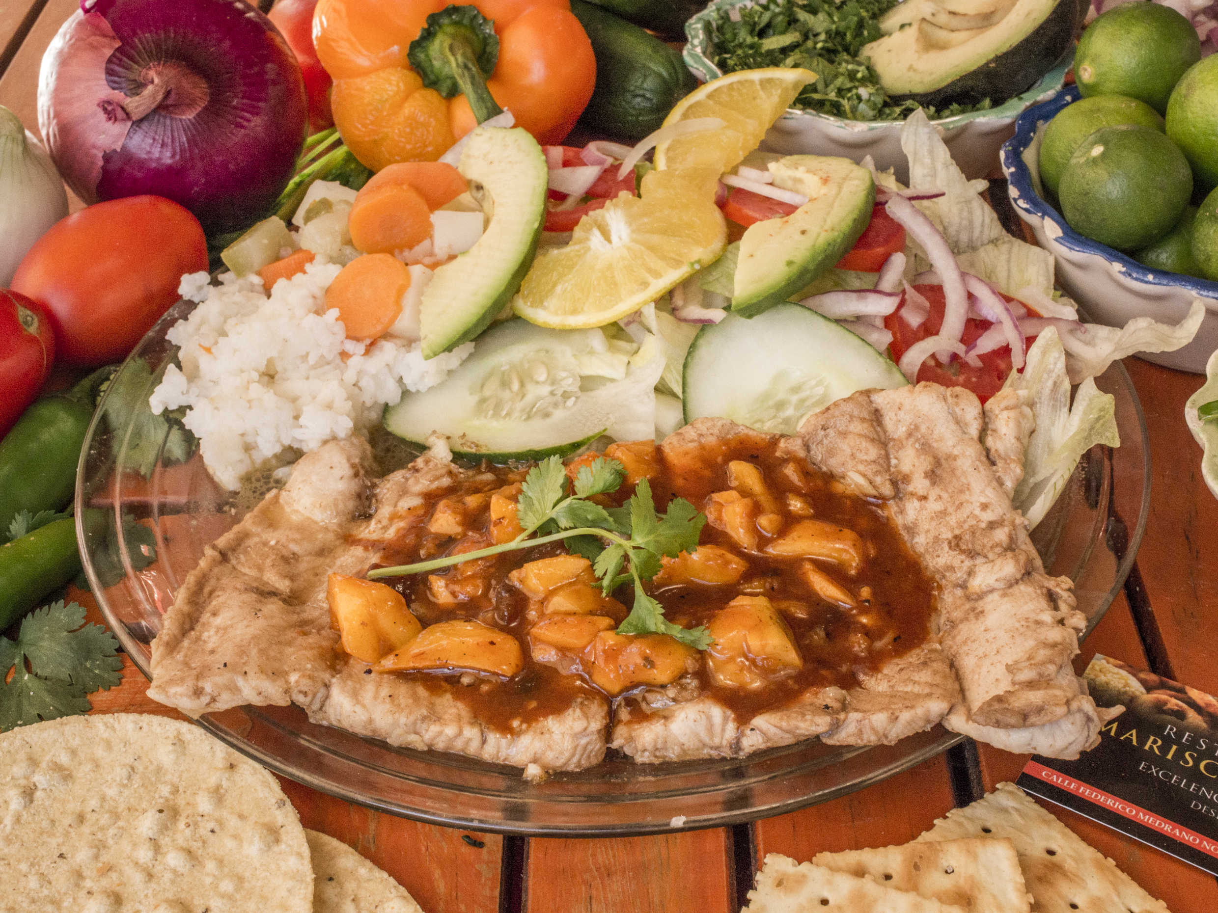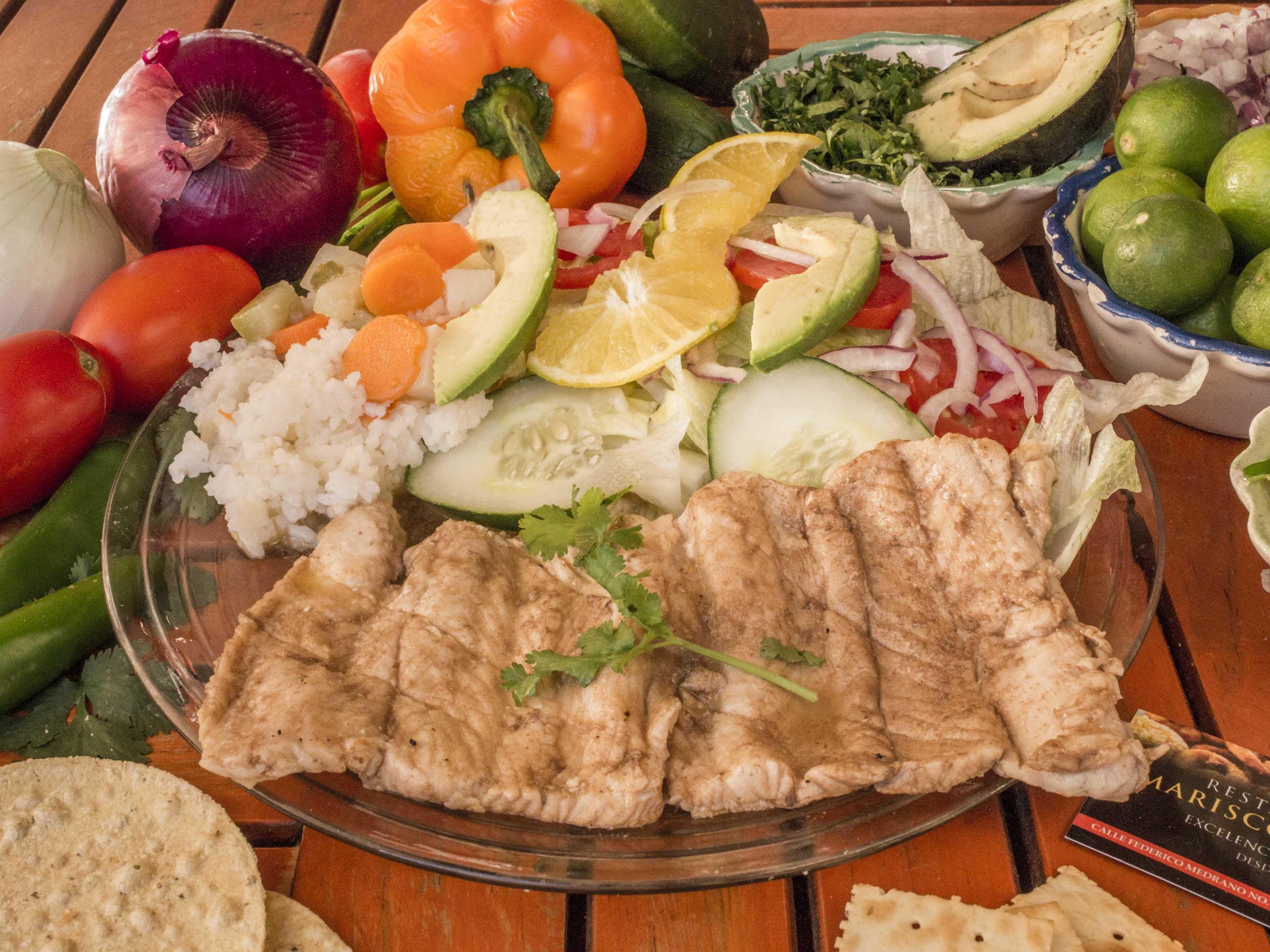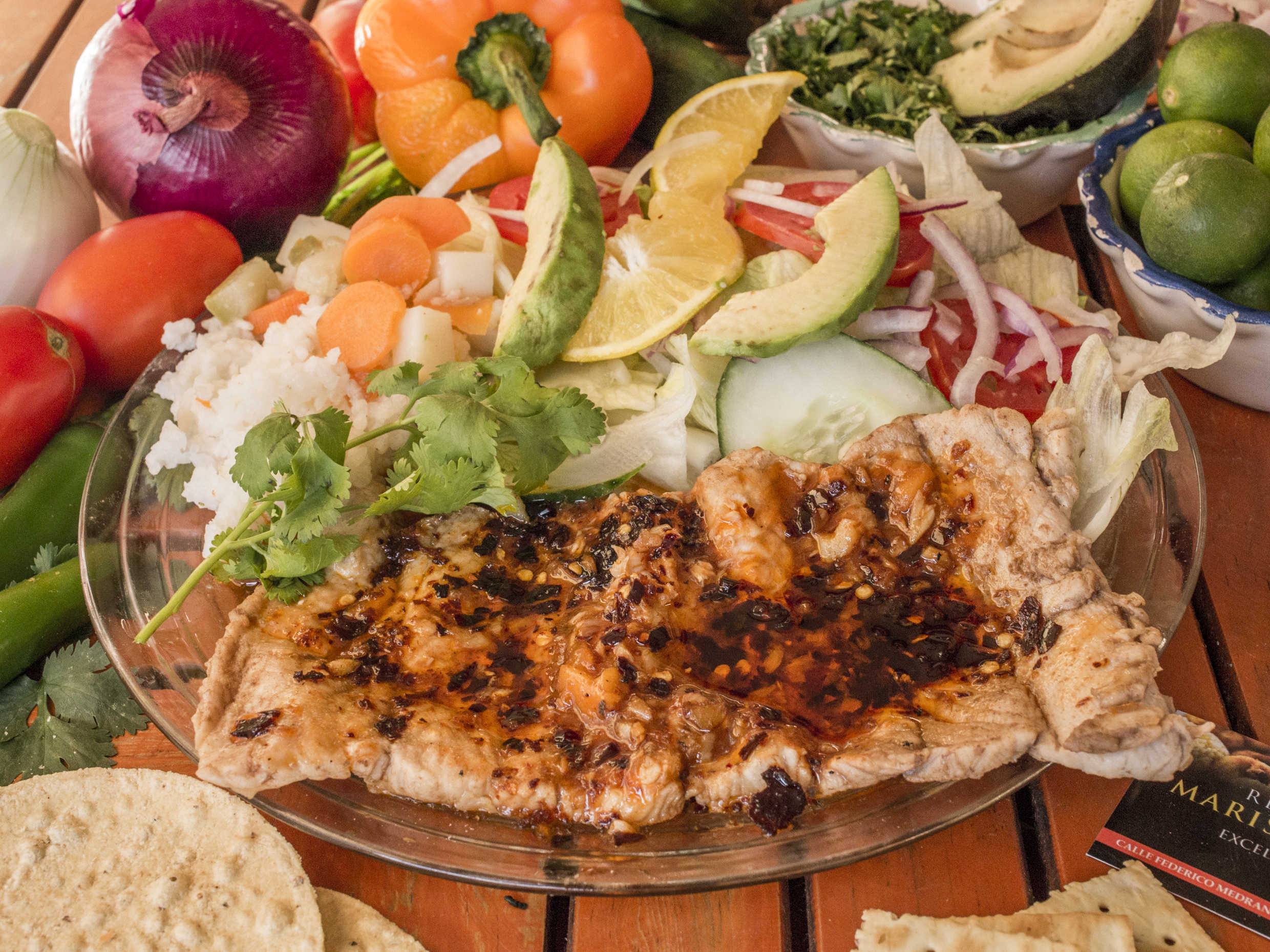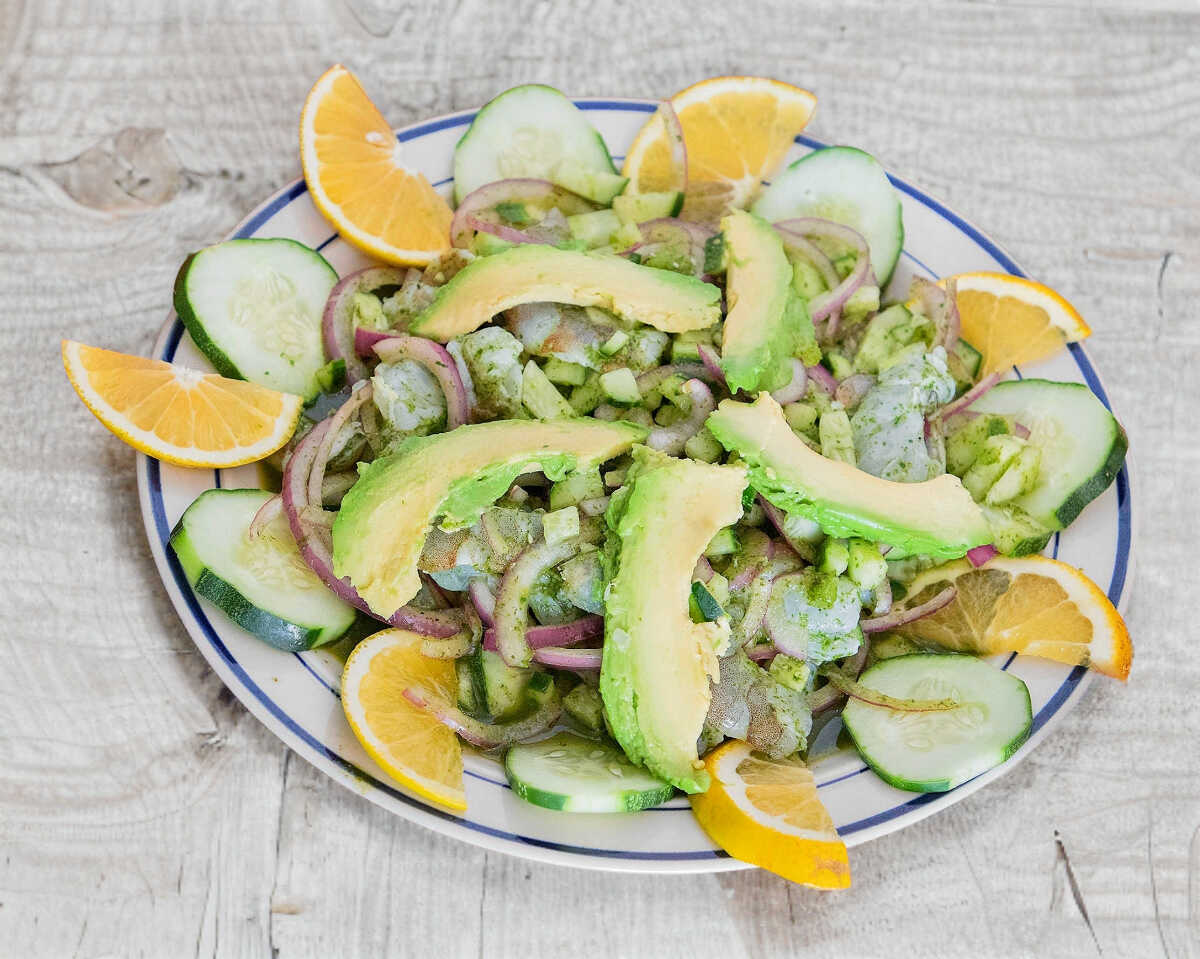 Se acompaña de 1 ó 3 mariscos a su elección, complementada de verdura marinada con salsas.