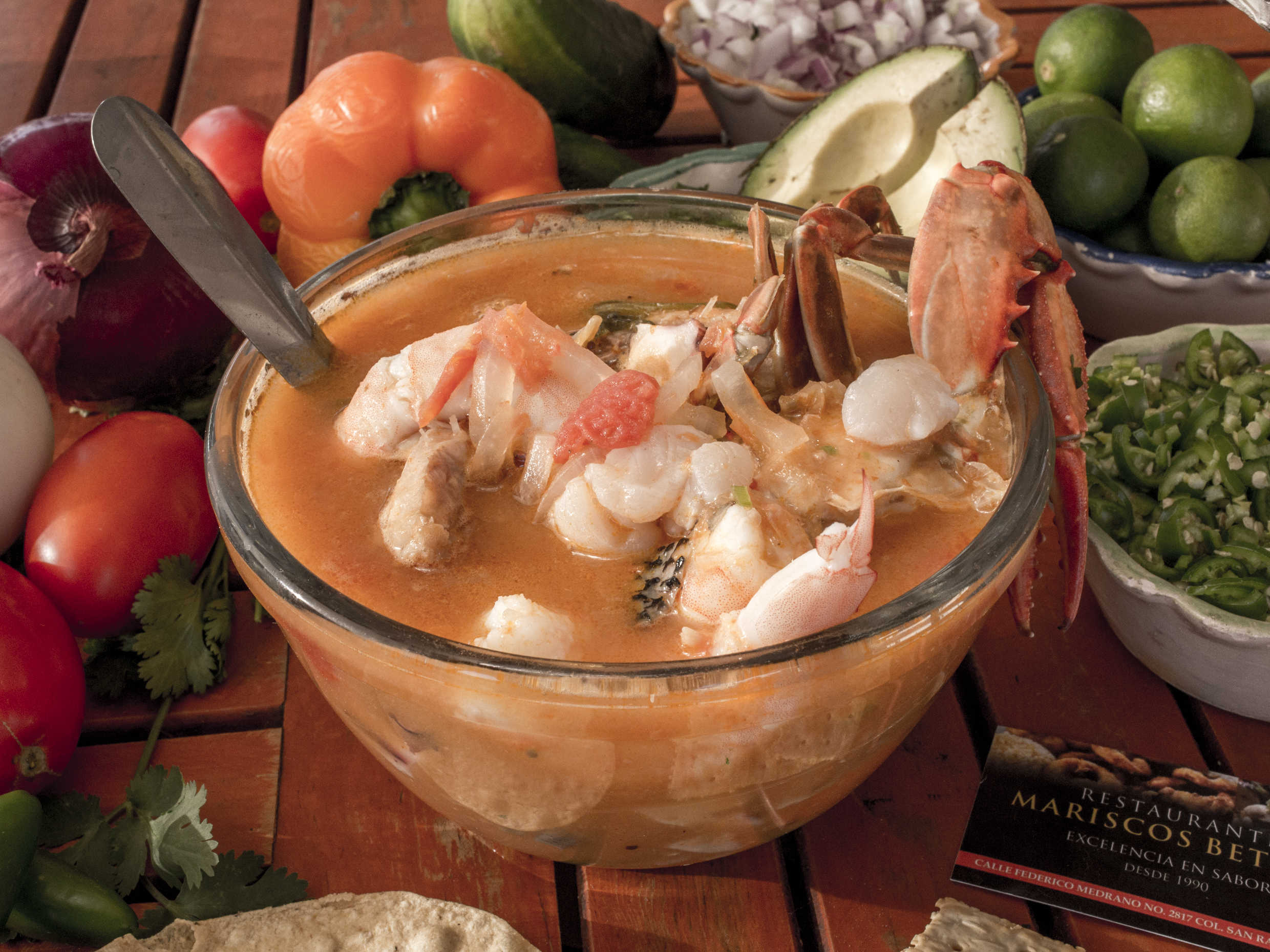 Tazón grande lleva camarón, pulpo, ostión, pescado, jaiba, callo y caracol.
