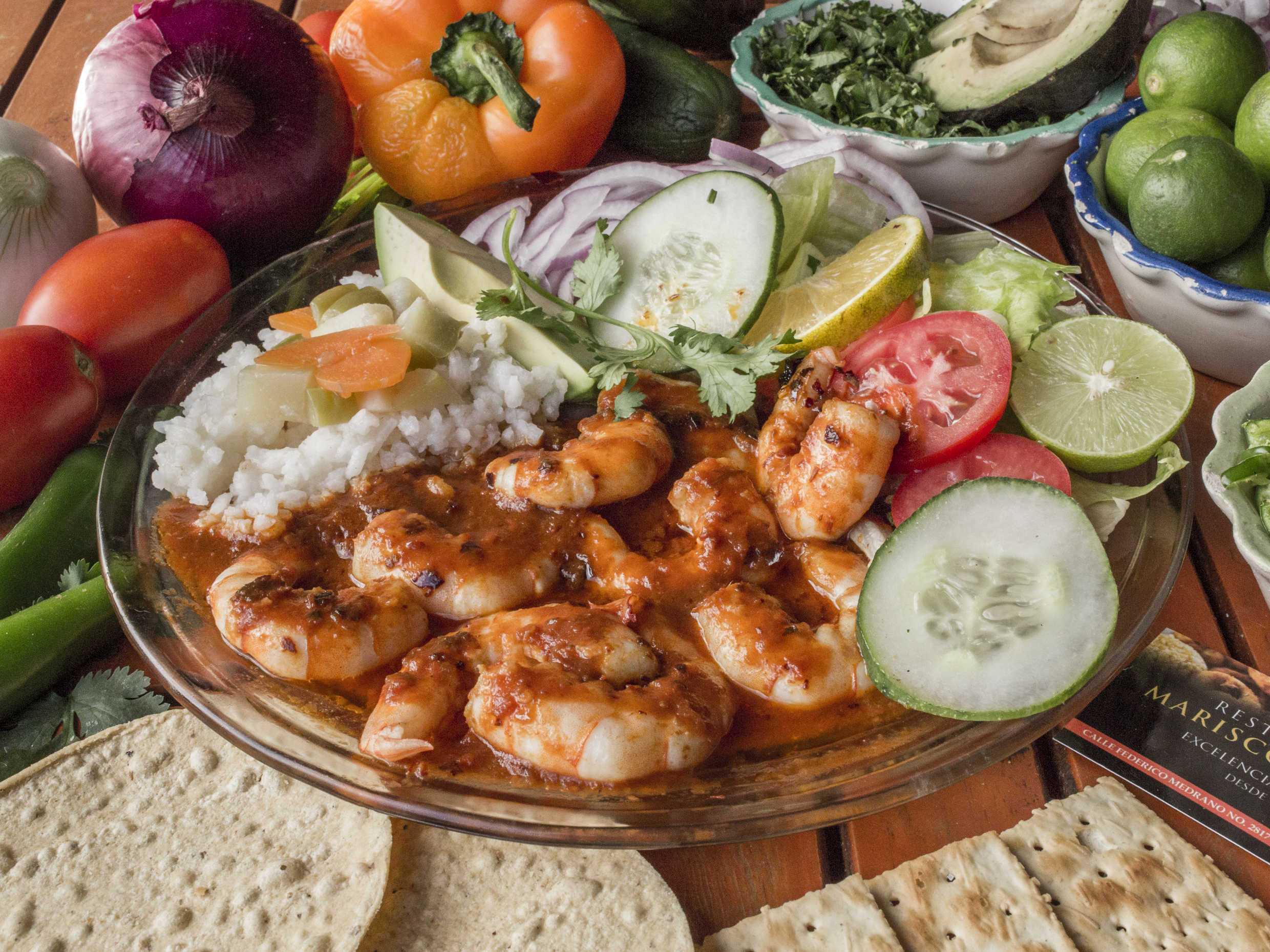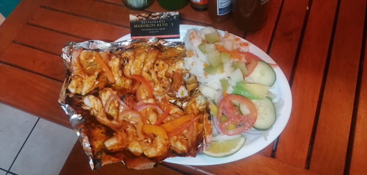 Lleva camarón, pulpo, callo, caracol y ostión acompañado de verdura.