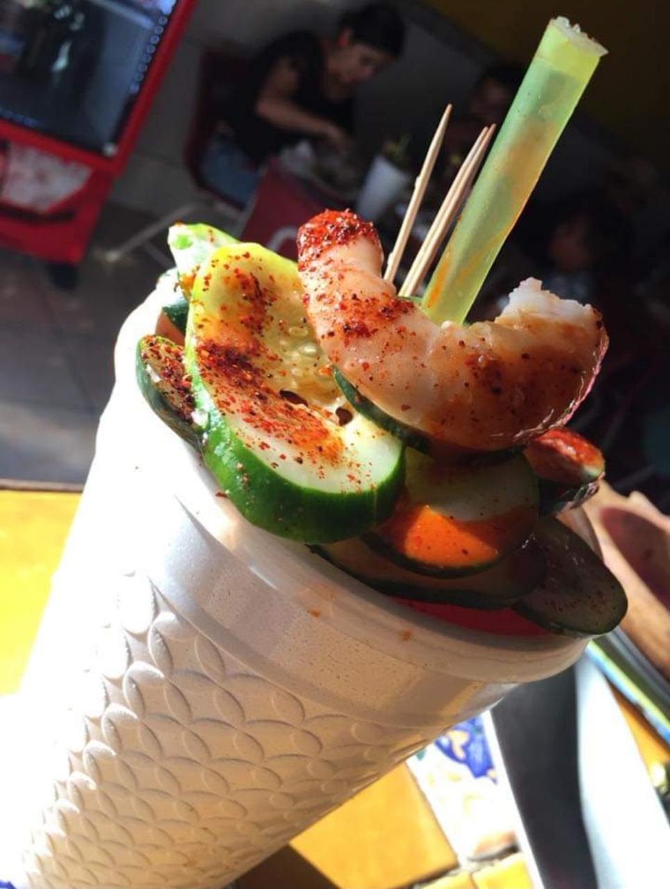 Lleva cerveza y jugo de tu gusto mango y tamarindo con 6 camarones y pepinos con sal y limón.