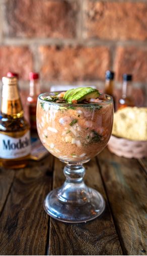 Pulpo y camarón. Todos los cocteles van preparados con pepino, cebolla, jitomate, cilantro, aguacate y caldo de la casa.