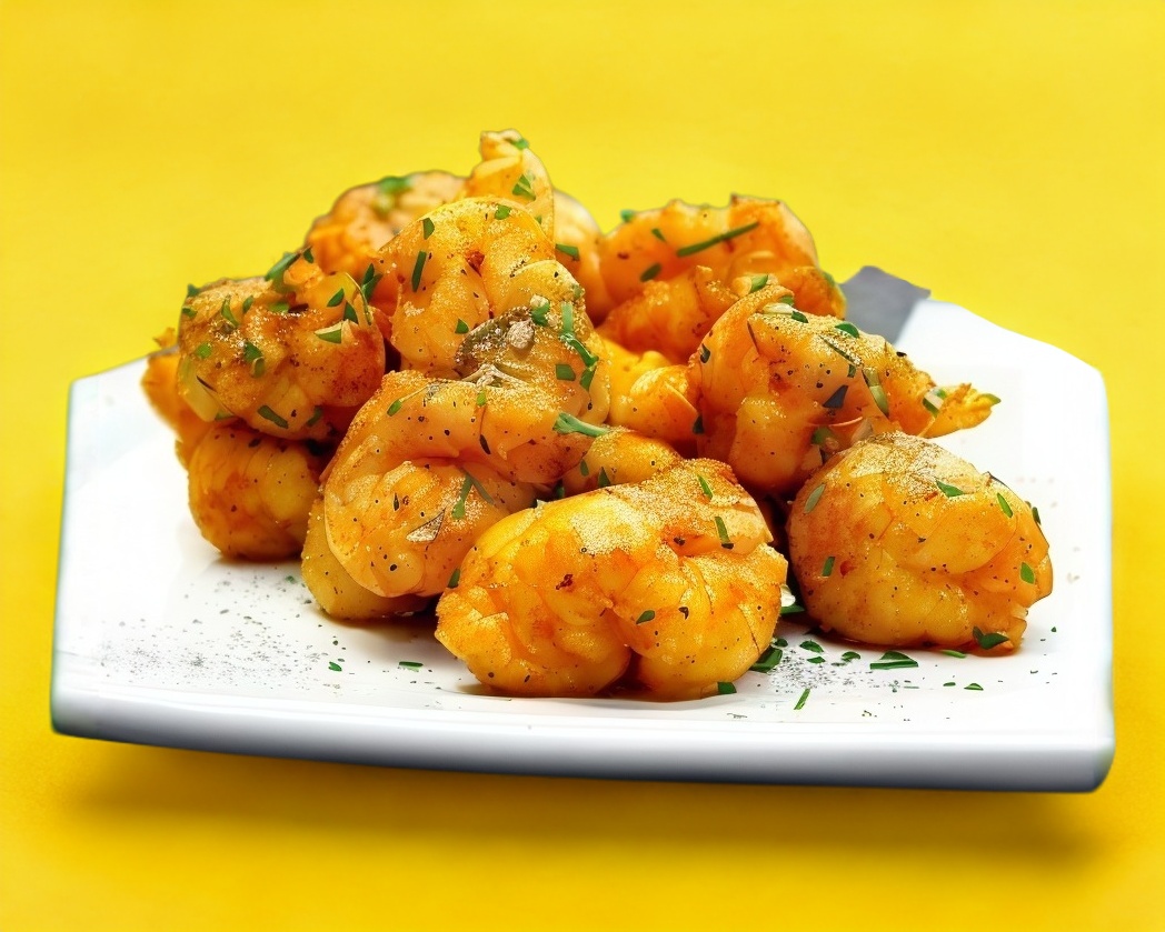 Camarones fritos y salteados en salsas negras y jugo de limón.