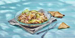 Acompañados con arroz y ensalada. Camarones cubiertos con coco rayado.