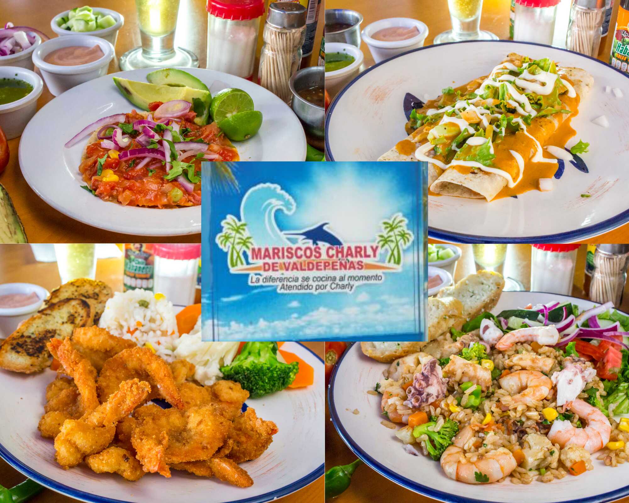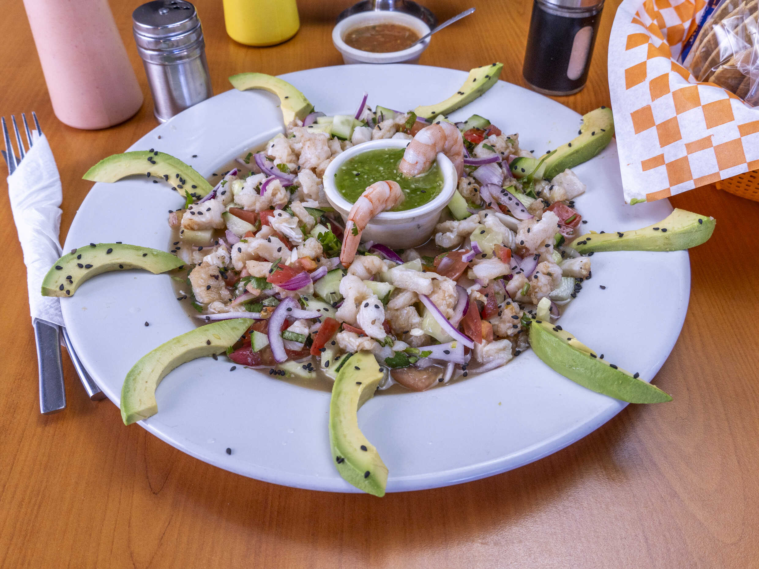 Camarón y pulpo, pepino, cebolla morada, cilantro y chile serrano.