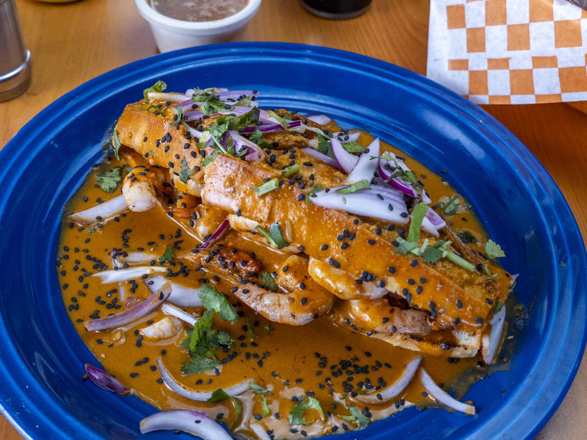 Camaron guisado mantequilla y salsa especial tipo curri.