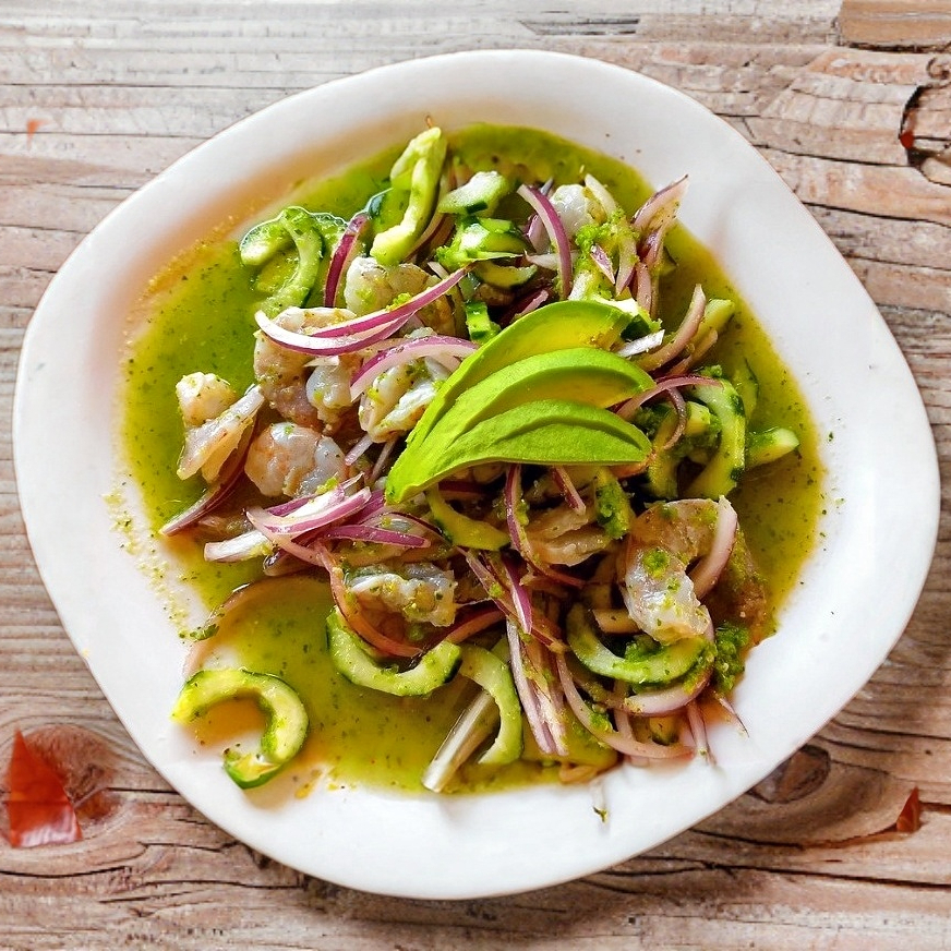 Camarón curtido en limón, con pepino y cebolla morada. Incluye tostada y picante.