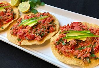 Tostada de marlín guisado con verdura, con un toque de chipotle. Incluye tostadas