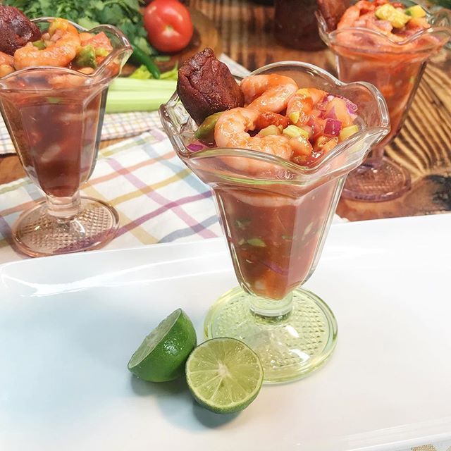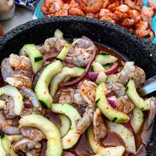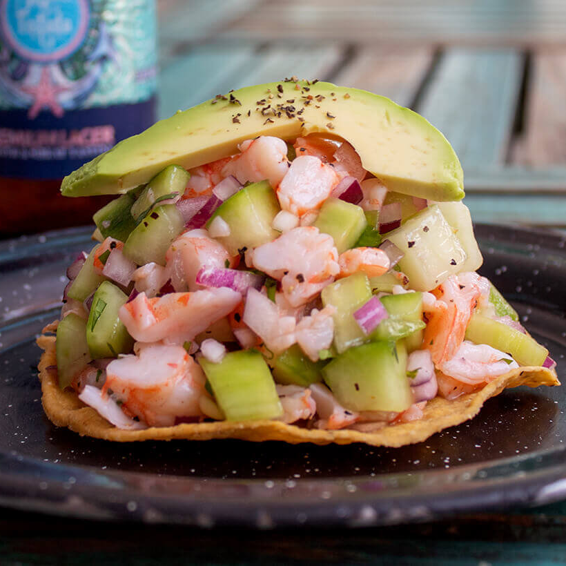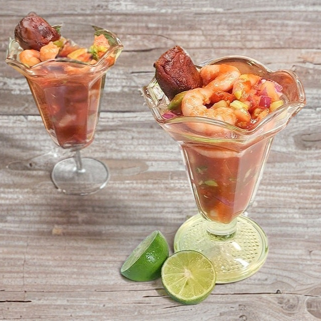 Camarones cocidos con aguacate, pico de gallo y salsas de la casa. Incluye tostadas y picante.