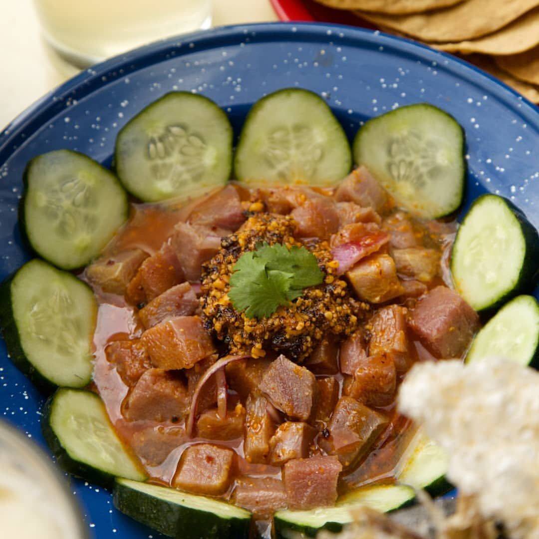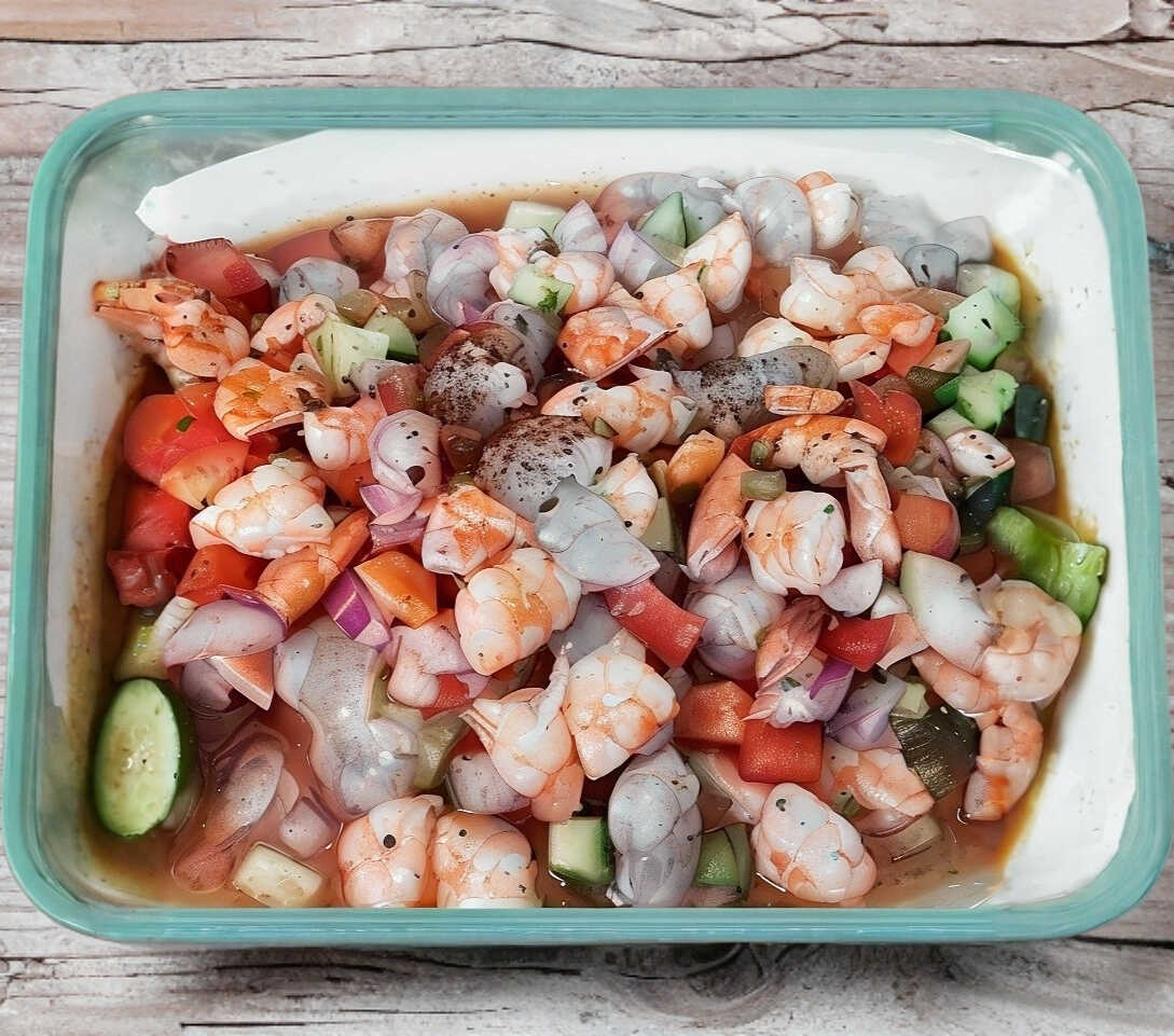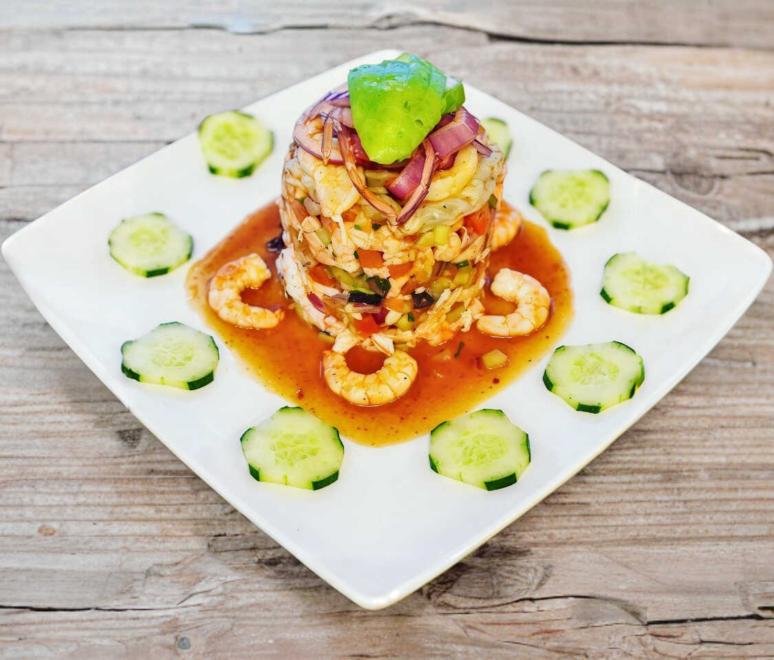 Camarón curtido en limón. Camarones cocidos, trocitos de pulpo y atún, con jitomate pepino y cebolla. Incluye tostadas y picante