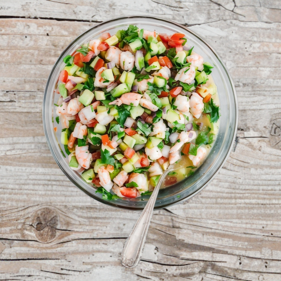 Trocitos de camarón curtidos en limón con jitomate pepino cilantro y cebolla, incluye tostadas y picante