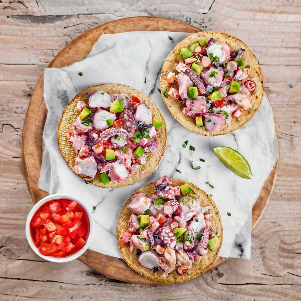 Tostada de trocitos de pulpo con jitomate pepino cebolla y cilantro, incluye tostadas y picante.