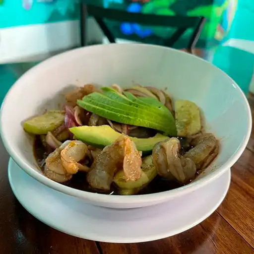 Cóctel con camarón, pulpo, ostión, pata, cebollas, limones, cilantro y tamaño a elegir.