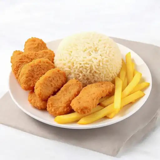 Arroz con tiras de pollo y papas francesas.