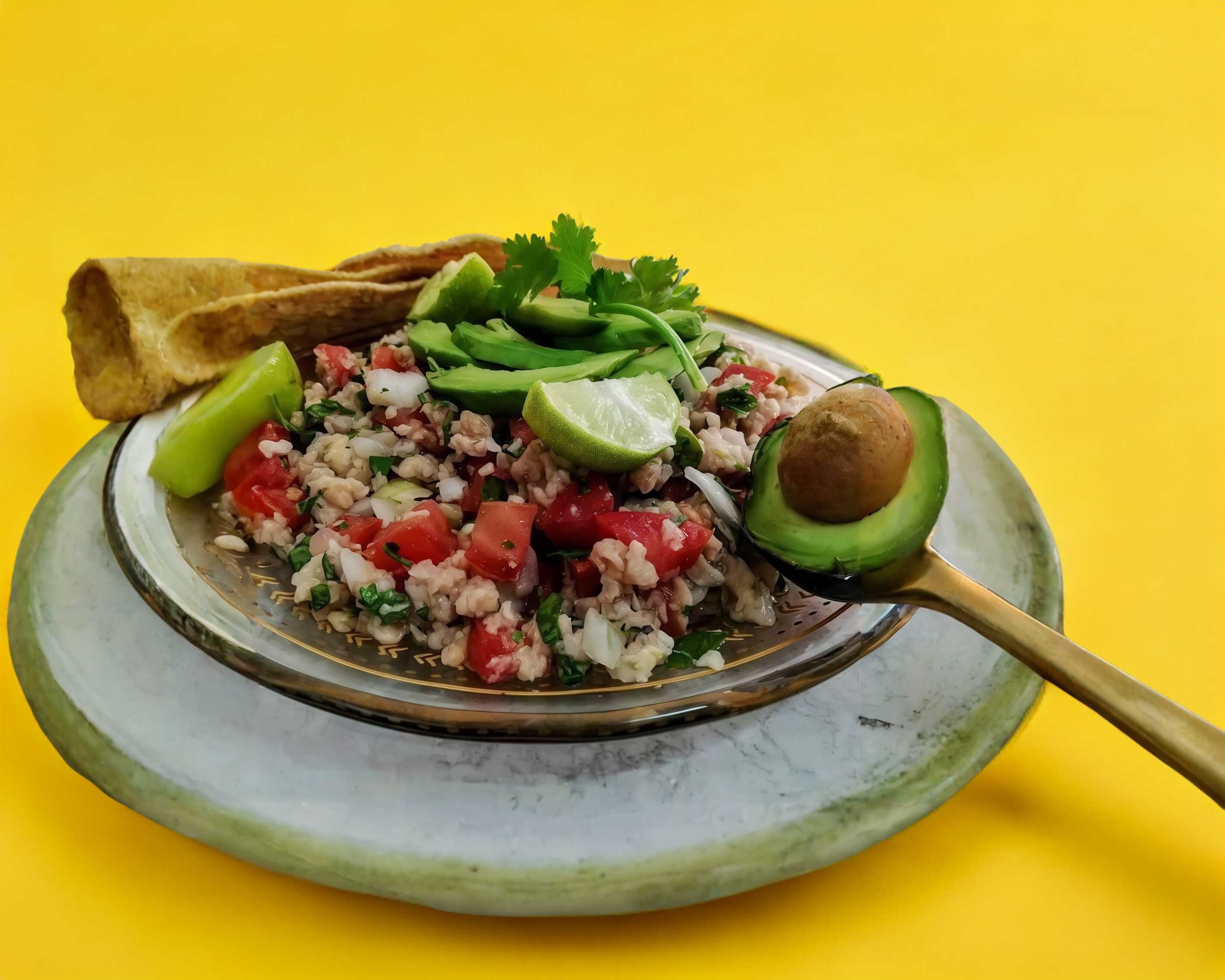 Tostada de ceviche acompañada con aguacate y cátsup.