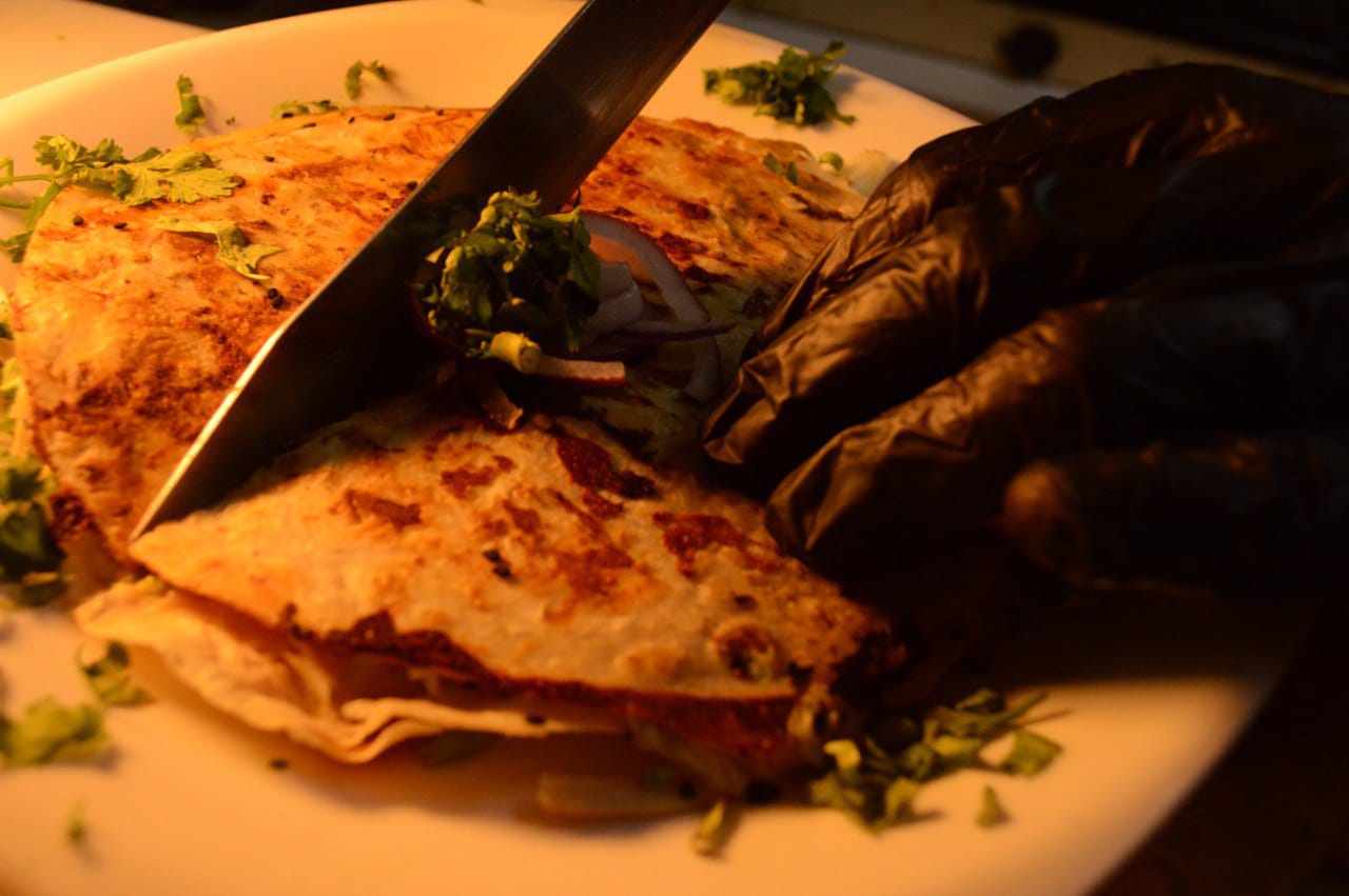 Quesadilla con tortilla de harina con camarón capeado, acompañado de salsas y ensaladas.