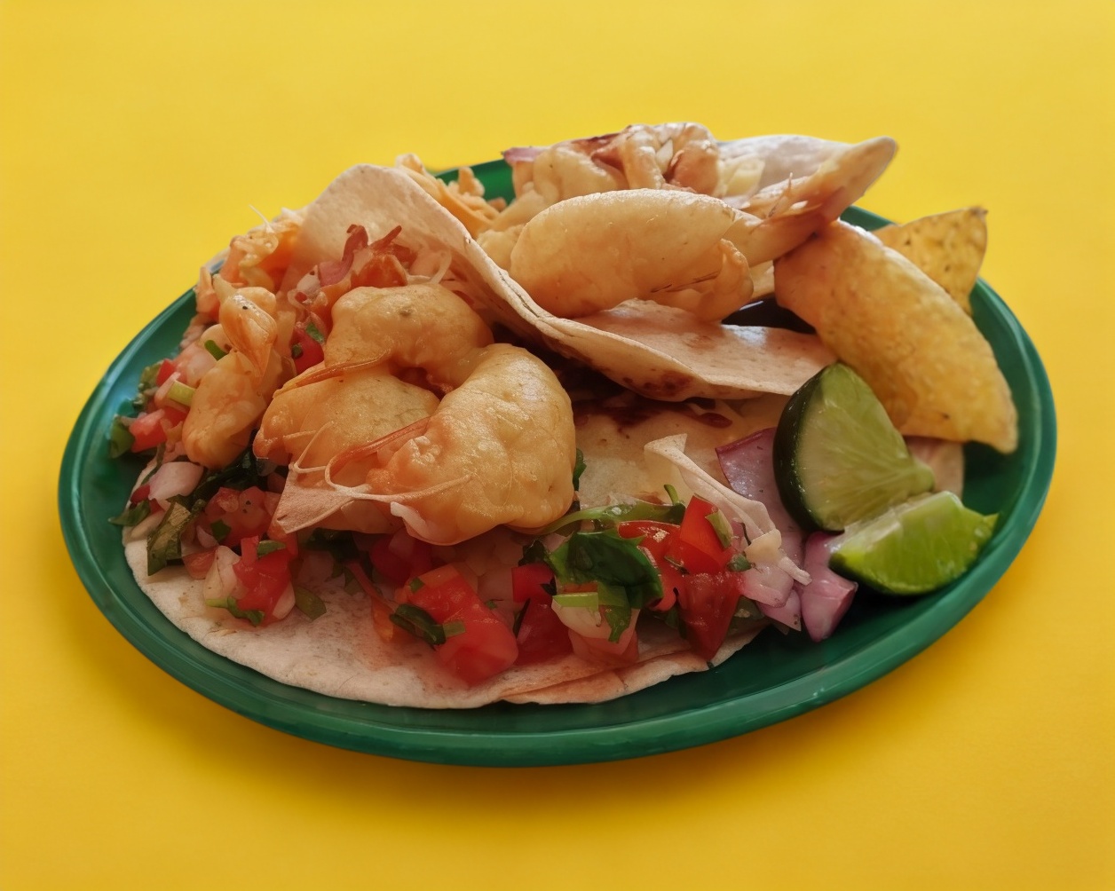 Taco de camarón capeado con doble tortilla acompañado de salsas y ensaladas.
