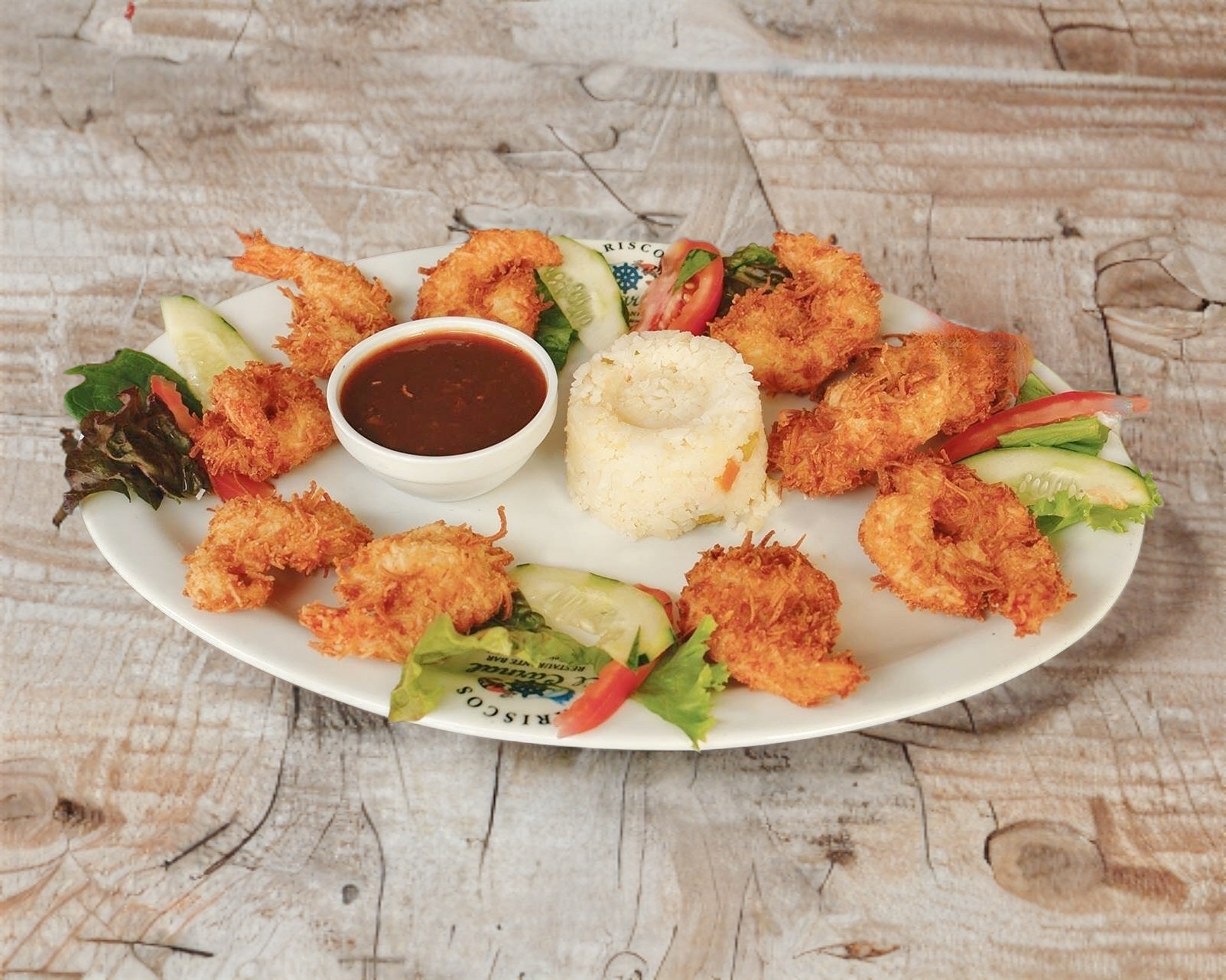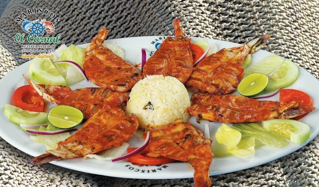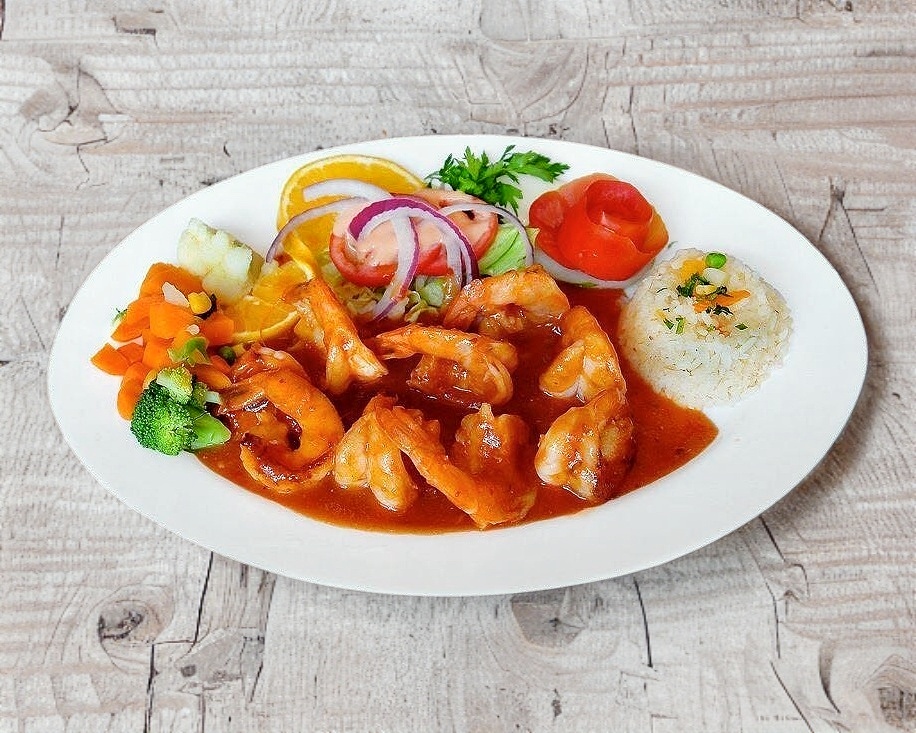 Camarones en salsa bechamel combinada con una salsa enchilosa sazonada con el chef.